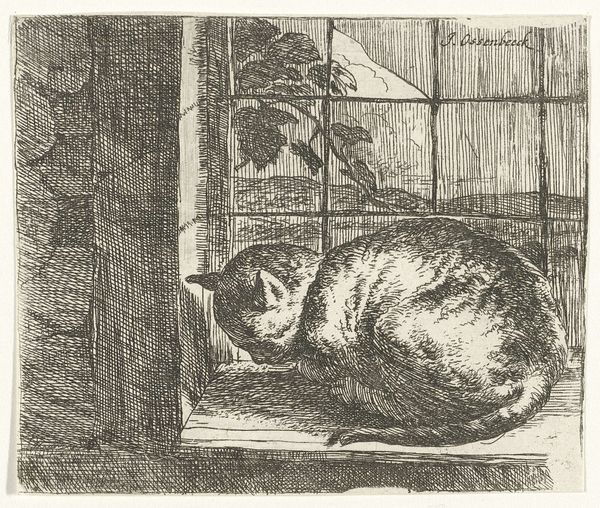 Curator: Welcome. We're standing before Charles Verlat's piece, "Kat en Muis," which translates to "Cat and Mouse," crafted sometime between 1834 and 1890 using pencil and graphite. Editor: It's like peeking into a secret world! The texture feels almost palpable, like I could reach out and touch that slightly menacing-looking feline. I am struck by its domestic intimacy. Curator: Yes, the intimacy is key. Verlat captures a fleeting moment within what seems like a very commonplace setting. It evokes ideas of predator-prey dynamics reflected in societal imbalances. Do you see how the cat, a symbol of power, is positioned, ready to pounce? Editor: I do! It's all lurking shadows and pent-up energy. The cat's eyes, those piercing little dots, pull you right in. There's something unsettling, yet magnetic about the contrast between the ordinary broom, just hanging there, and the raw instinct of the hunter. Curator: Exactly! This contrast creates a tension. It also highlights the casual acceptance of violence in domestic spaces, whether metaphorical or literal. This work engages with complex themes of power and vulnerability within the confines of everyday life. And I must also comment on Verlat's use of perspective; we are granted almost the mouse's view of events as they unfold. Editor: Which amps up the tension, of course. But there's also this almost dreamy quality in the blurring of details, lending it the impression of a hazy half-forgotten memory. Perhaps, the cat, in the role of villain, merely symbolizes a past, internal obstacle, no larger than a tiny mouse in reality. Curator: I think that is certainly an equally valid approach. It is also worthwhile thinking about this sketch within the context of 19th century genre painting which sought to elevate these snapshots of ordinary, yet profound moments. Editor: Well, that perspective certainly adds another layer! It makes you wonder what other stories are hiding in plain sight, ready to be uncovered with a little… scrutiny? It's been delightful uncovering this work with you! Curator: Indeed. It shows us the power of art to challenge our perceptions and incite dialogue around prevalent issues which are relevant to our histories and today.