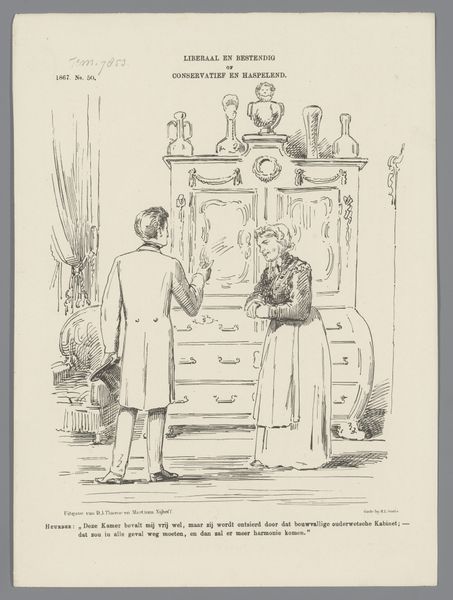 This political cartoon, made in 1867 by Johan Michaël Schmidt Crans, is printed on paper using etching and line engraving. A satire on the resignation of Trakranen as Minister of Colonies, the print depicts a dresser, standing in for the Dutch cabinet, in a state of disarray. The production of prints like this one was relatively straightforward, involving the creation of a matrix – in this case, likely a metal plate – that was then inked and pressed onto paper. The image shows a familiar item of furniture, here invested with symbolic meaning. The print would have been relatively inexpensive and accessible, allowing for broad distribution of its political message. We might consider how the artist employed his skill to convey his viewpoint on the politics of his day, using familiar visual language to engage a broad audience. And, as with any designed object, it is embedded with social meaning about labor, class, and power. Understanding the context of its production can deepen our appreciation of its significance as a cultural artifact.