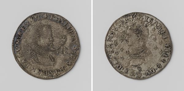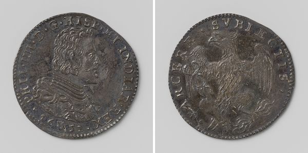 Curator: This metal round from 1537 by Peter Flötner captures the likeness of George, Duke of Saxony, offering a glimpse into the Northern Renaissance portraiture. Editor: There’s an immediate sense of solidity and detail. The textures are so minutely rendered – from the Duke’s beard to the intricate design on what looks like a coat-of-arms on the other side. Curator: It speaks to the Renaissance fascination with commemorating power and lineage through portraiture. The coin-like quality of the piece served both as personal memento and a form of propaganda for the Duke and his legacy. Editor: You're right, there's certainly something powerful in how that profile dominates the circular space. The text almost serves as a frame emphasizing the dominance of the face. I am curious about the composition and why he chose profile rather than a three-quarter view. It feels somewhat antiquated even for its time. Curator: The profile view has associations with ancient Roman coins, and signals the Duke's connection to classical virtues and power, which was very much in vogue. Flötner's decision places George firmly within that historical and cultural context. Think also how Germany, and specifically Saxony, were going through a monumental religious transformation. Every symbol matters here. Editor: Ah, yes the profile is like a seal of power! It works, I guess. Though the rendering of his garments could be less stiff; they almost look stamped, reducing dynamism within the composition. Curator: It’s a common trait in Northern Renaissance portraiture and stems from printmaking. You're less interested in individual expressiveness and more about social type and ideal status, communicated through meticulous, symbolic detailing and, well, status-signaling outfits! Editor: All true! Considering those limitations and that the purpose was clear and achieved, I find myself coming back to the surface—its muted luster and precise carving feel uniquely tangible and immediate. Curator: And for me, its political and cultural echoes make this far more than simply an interesting visual study. Editor: I think we’ve both unearthed some valuable aspects, and for a small coin, this artwork clearly carries a lot of significance!