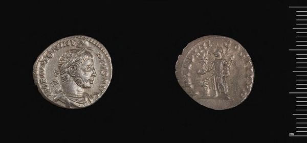 Curator: The Denarius of Severus Alexander presents a powerful profile, doesn’t it? It seems both fragile and imposing. Editor: Absolutely. A small coin, yet monumental in its symbolic weight. The gaze projects authority. Curator: Precisely. This denarius, now residing at the Harvard Art Museums, offers a glimpse into the image-making strategies of the Roman Empire. These aren’t mere objects of currency; they are tools of propaganda. Editor: I wonder about the figure on the reverse. Is it a representation of a female power, perhaps a deified empress, or an allegory of Rome herself? These coins were, in a way, the social media of their time. Curator: Exactly. The coin, in its own right, reflects on gender roles and the perceived power of women in antiquity. It's a form of Roman art with multiple intersectional dialogues within. Editor: I find it fascinating how such a modest object speaks volumes about power, representation, and ideology. Curator: Indeed. A reminder that even the smallest artifacts can reveal the grandest narratives. Editor: I will keep that in mind.
