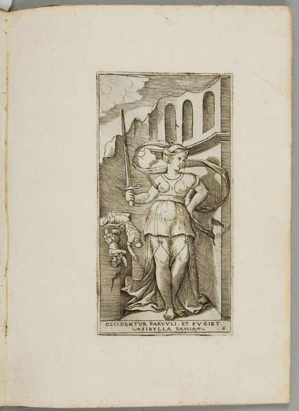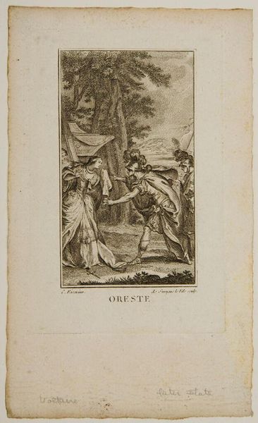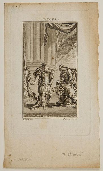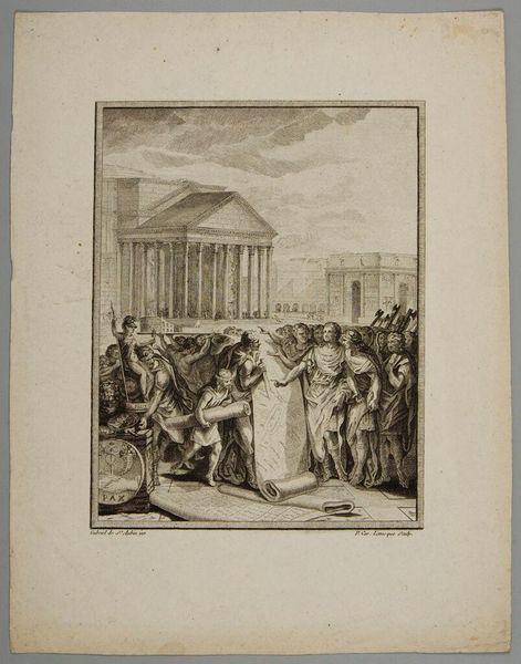 Editor: This is Joseph de Longueil's "The Laws of Minos," an etching. The scene feels quite tense, with figures in distress and others bearing arms. What symbols do you see embedded in this image? Curator: The raised axe, the spears, the supplicant figure...These are potent symbols of power, justice, and vulnerability. Note how the image draws from a classical visual vocabulary to lend authority to the scene, even as it questions the very nature of law. What emotional response does this evoke? Editor: It makes me question the fairness of the legal system, especially for the vulnerable. Thank you for pointing out the artistic choices that enhance those themes. Curator: Indeed. It reveals how images, like laws, are never neutral, always carrying embedded cultural memory.