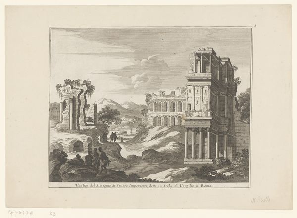 This etching by Nicolas Perelle depicts a ruined temple by the sea. Dominating the scene are the temple’s remaining columns, potent symbols of classical antiquity and lost grandeur. Temples historically were centers of spiritual and civic life, embodying order and stability. Notice how these columns reappear across centuries and cultures, from ancient Greece to Roman monuments, and even in Renaissance architecture. They reflect humanity's enduring quest for permanence amidst decay. Here, the dilapidated state of the columns introduces the concept of 'memento mori', reminding us of the transience of human achievements. The ruins evoke a sense of nostalgia, tapping into our collective memory of past civilizations. This melancholic view—temples, bridges, figures in repose—reveals the cycle of rise and fall inherent in history, engaging viewers with the inevitable passage of time, resonating deeply within our subconscious. The classical motif takes on different meanings, reflecting humanity's constant dialogue with its own history.