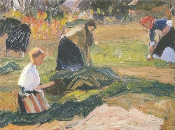 Camille Pissarro made this oil on canvas painting, Laundresses at Eragny, sometime near the end of the 19th century in France. The image depicts two working women in a rural setting, absorbed in the labour of washing clothes. Pissarro, like many impressionist painters, often turned his attention to scenes of everyday life, however this was at a time when the French academy considered such subjects to be beneath the dignity of "high art". Paintings like this, therefore, carry a quiet sort of political charge, a sense of solidarity with the working class. To truly understand the significance of Pissarro's painting, one must delve into the social and economic realities of rural France at the time, the place of women within that society, and the politics of the art world. Scholarly articles, historical records, and critical analyses can help us understand more. The meaning of art is always contingent on its social and institutional context.