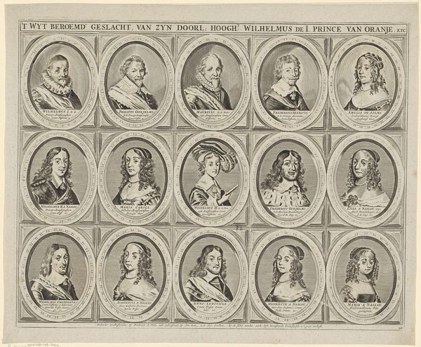 Editor: Here we have "Proclamation in Ghent of Charles II of Spain as Count of Flanders," a print from 1666 or 67 by Lucas Vorsterman the Younger. It's composed of portrait medallions, a bit like a royal family tree. I find the rigid structure quite striking. What historical context informs the public display of such imagery? Curator: This piece functions as a form of political propaganda. Consider its production date, during the reign of Charles II of Spain. Flanders, now part of Belgium, was then under Spanish rule, though contested. Vorsterman's print visualizes and, therefore, legitimizes Charles’s claim to power by depicting his lineage. Note how each portrait is paired with heraldry, underscoring noble ancestry. Who do you imagine was the target audience for such a detailed genealogy? Editor: Presumably the Flemish aristocracy or other powerful figures who might have been hesitant about Spanish rule? People needing convincing. Curator: Precisely! Prints like this, disseminated relatively widely, were crucial tools for shaping public opinion and solidifying power in an era before mass media. The museum's role in preserving and exhibiting such items allows us to understand better how images were mobilized politically. Consider the very act of "proclaiming" – it suggests an active declaration intended for public consumption. Now, does seeing it that way alter your perception of it? Editor: Absolutely. Knowing its purpose makes the formal rigidity seem deliberate, designed to convey unwavering authority rather than just family history. Curator: Indeed. Reflecting on this, it underlines the importance of critically examining images, understanding their initial context, and interrogating the power dynamics they embody. What were your expectations, and were they shifted in new directions? Editor: My view has shifted – what appeared to be merely a decorative display of portraits, is, in fact, a highly political statement intended to stabilize Charles's reign, using visual communication to convey authority and solidify claims. Thanks for clarifying the significance of its cultural setting!