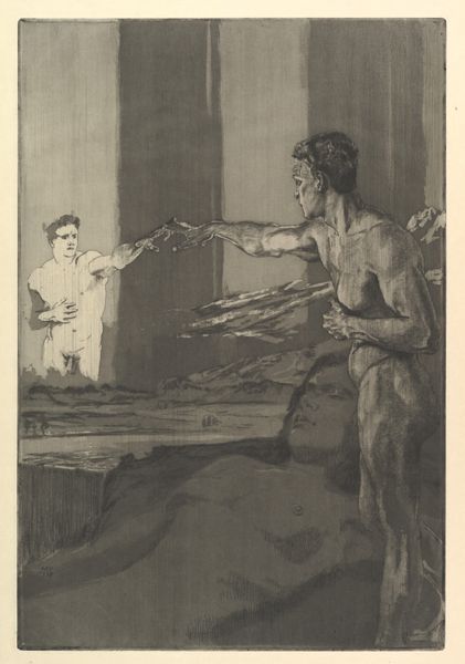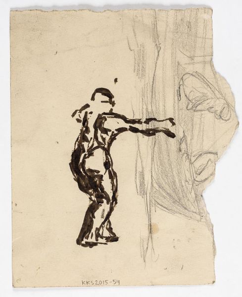 Editor: This drawing, "To studier af en ringer samt detailstudier af hans fod og baghoved," which roughly translates to “Two Studies of a Ringer, with Detailed Studies of His Foot and Back of Head," created between 1855 and 1933 by Poul S. Christiansen, showcases two men pulling ropes in what seems to be pencil sketches. One figure is heavily shaded, the other outlined in red. It feels like a study of labor. What stands out to you in this piece? Curator: The layered process speaks volumes. The material realities – the graphite and paper – demonstrate a physical act of recording observation. How does the artist's hand manifest in these renderings? We see the intense cross-hatching creating form on one figure in contrast to the tentative red outlines of the other, suggesting a duality, perhaps the weighing of options for the composition. This isn't just about representation, it's about how representation is *made*. The choice of the ringer as subject directs us towards ideas of labor itself – particularly labor associated with organized religion. How does the image challenge our perception of this specific profession and religious materiality itself? Editor: It's interesting to think about the materiality in that context, how labor becomes almost performative through the art itself. Is the artist depicting labor or participating in labor by drawing it? Curator: Exactly. The drawing also foregrounds the class-based connotations of such labor in the mid-19th Century. This makes the work resonate strongly with me by speaking of consumption and status, by depicting work in such great detail and consideration. Are we looking at academic exercise or at something closer to a comment on society through observation and work? Editor: This perspective really broadens the impact, doesn’t it? It goes beyond just depicting the action to questioning the role of labor in society at the time. Curator: Precisely. Editor: I hadn't considered it so deeply, but now it resonates differently, connecting the materials to larger social ideas.