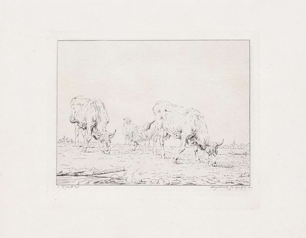 Editor: This is Kerr Eby's "Shadows on the Agawa, No. 2" from 1929, an etching printed with delicate, almost whispered, lines. There's something very quiet and still about it, despite the presence of such a large animal. What do you make of this work? Curator: Quiet indeed! It’s like a memory, a half-recalled dream shimmering on the edge of consciousness. Look how the light seems to emanate not just from the scene, but from within the paper itself. The way the artist uses the etching technique, almost pointillist at times, dissolves the edges of reality. It's as though we're catching a glimpse into another world, don't you think? Editor: Yes, it definitely feels like peeking into something private. The moose almost blends with the shadows and foliage. Is there something more than just nature here? Curator: Absolutely! Eby, while a master of depicting nature, imbues it with a sense of romantic introspection. He’s not simply recording what he sees; he’s filtering it through his own sensibility. This is less about a moose in water and more about… well, the fleeting nature of existence. That melancholic moodiness seeps from the paper like morning mist. He also often depicted scenes of war, his vision may just have seeped into everything he saw. How do you see the balance of light and shadow affecting this scene? Editor: I think the soft lighting almost romanticizes the natural elements and minimizes some of the mass of the animal itself. It's less imposing and more serene than I expected a moose to look. Curator: Exactly. See how it is part of the scene; at peace. It all pulls together to a beautifully haunting portrait. I keep coming back to those blurred edges, where does nature stop, and feeling start? Editor: It’s amazing to think about the emotion someone can evoke from pencil and paper, and make it echo almost a century later. Thanks, this was really insightful.