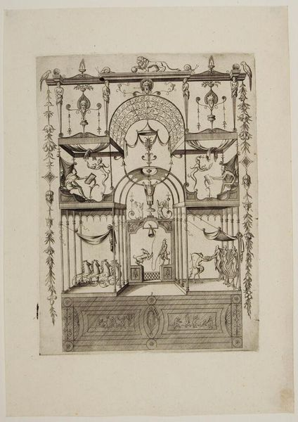 Editor: This is "Decoration XVI" by an anonymous artist. It's a print showing elaborate decorative schemes. I'm struck by the rigid symmetry. What can you tell me about its social context? Curator: Considering its symmetrical and ornamental elements, it likely reflects the influence of classical antiquity during a period of renewed interest in those styles. How do you think such imagery would have been received by the public then? Editor: Perhaps as aspirational, showing an ideal of beauty and order? Curator: Precisely. These prints often circulated as models, influencing architectural and decorative trends, thereby shaping the visual environment and conveying social values. Editor: So it's not just art for art's sake, but part of a broader cultural conversation? Curator: Exactly. The distribution and reception of these images played a role in shaping taste and cultural norms. Food for thought, isn't it?