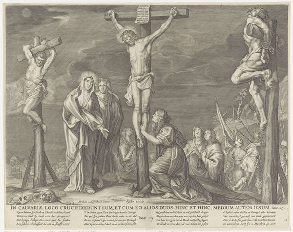 This engraving, "Crucifixion of Christ," was created by Pieter de Jode I. Here we witness a scene laden with symbolic weight: Christ on the cross, the ultimate symbol of sacrifice. His outstretched arms are a gesture of divine love, echoing through the ages in countless depictions of martyrs and saviors. Consider the Roman soldiers on horseback. Are they merely figures of authority, or do they embody the brutal force of empire, a recurring motif in art history? Their presence reminds me of equestrian statues of emperors, symbols of power and domination, yet here, they participate in an act that subverts their authority. The weeping figures at the foot of the cross evoke the ancient Greek tradition of mourning figures in funerary art. This emotional display, a raw expression of grief, transcends time. It speaks to a collective memory of loss, a primal response that resonates across cultures. Observe the cyclical nature of these motifs. They resurface, evolve, and take on new meanings, woven into the fabric of our shared human experience.