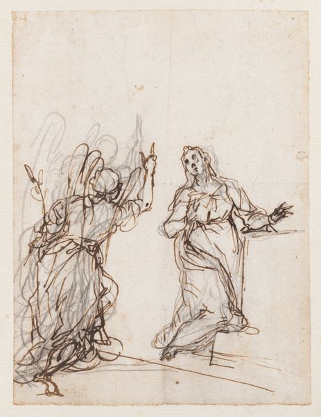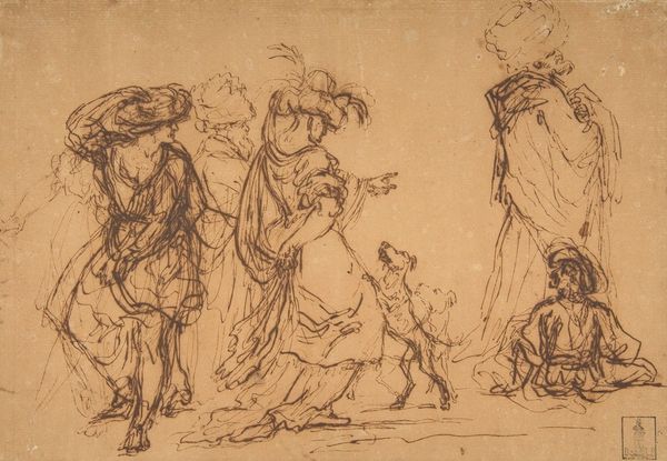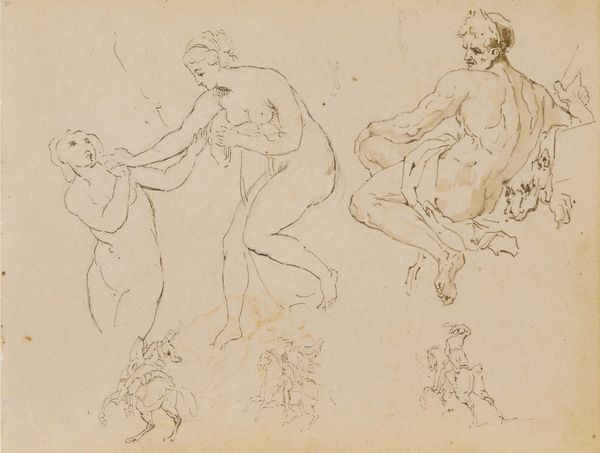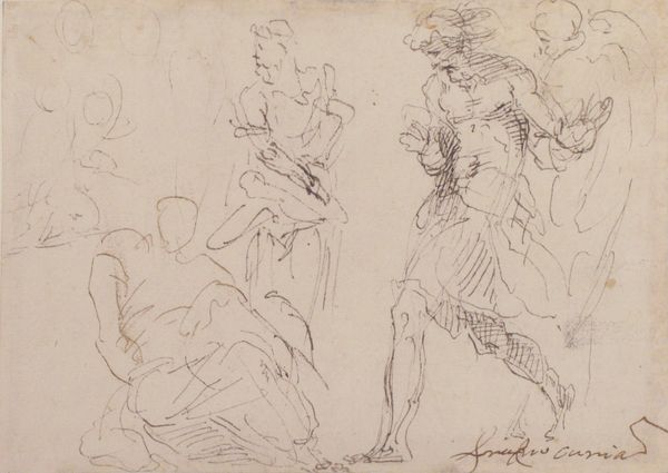 Curator: Here we have a "Study Sheet" by Perino del Vaga. Editor: It feels so immediate, doesn’t it? The ink on paper has a directness that makes me feel like I'm looking over the artist's shoulder. Curator: Precisely! And if we consider the figures here, the draped one in the center—doesn't the gesture remind you of depictions of prophets or sibyls, figures associated with divine knowledge? Editor: I see what you mean. And it’s intriguing how the line varies in weight, emphasizing certain anatomical structures. One wonders about the paper itself, its source and its cost for the artist. Curator: A crucial consideration, of course! The paper would have been a valuable resource, encouraging efficient use. The layering of figures demonstrates a real economy of means. Editor: Yes, and looking at these figures together, I think about how the means of production influence the meaning. It's less about the finished artwork and more about this moment of process and production. Curator: I find myself contemplating how these studies become building blocks, informing larger narratives. Editor: Ultimately, for me, it's about understanding the conditions in which art is made, not just the final image.