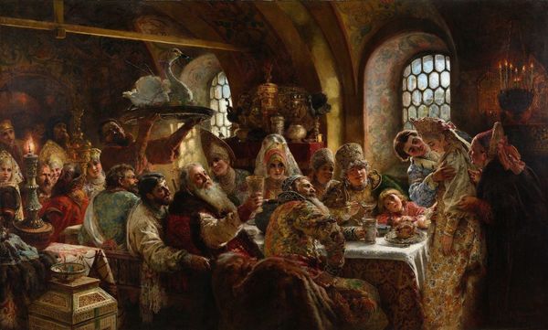 Editor: Konstantin Makovsky’s “Before the Wedding,” painted in 1890, presents such a vibrant scene of what looks like a Russian aristocratic family. There's a quiet tension in the air. It's a painting of anticipation, maybe even a bit of anxiety. What jumps out at you when you look at this, particularly in terms of how it reflects cultural memory? Curator: I see echoes of rituals that run deep, rituals encoded in gestures, costumes, and even the objects scattered throughout the room. The bride's lowered gaze is a potent symbol – not just of modesty, as one might initially assume, but also perhaps a submission to tradition, a surrendering of personal will to communal expectations. Look at the elaborate headdresses; they aren't just fashion, are they? Editor: They seem to be broadcasting status, definitely. Layers of wealth and identity. But status for whom? The individual, or the family? Curator: Precisely. The adornment serves the individual *through* service to the family's legacy. These are visual cues intended to solidify lineage and cultural continuity. Even the arrangement of figures seems deliberate: the elders presiding, the younger women attending, all framing the central figure of the bride. Doesn't that suggest a carefully constructed narrative? Editor: Yes, almost like a stage setting. Each element feels so carefully placed to convey meaning. Are there hidden symbols here that a contemporary viewer might miss? Curator: Without a doubt. The jewelry box, the specific embroidery on the garments – these would have spoken volumes to a 19th-century Russian audience. They represented familial wealth, the dowry, and blessings for a fruitful marriage, connecting present hopes with generations past. It invites us to consider how objects become imbued with cultural weight over time, wouldn't you agree? Editor: Absolutely. I hadn't considered the dowry as a symbol itself, laden with that much historical context. This has definitely given me a new perspective on how to read paintings for their embedded cultural meanings.