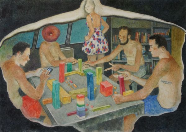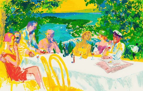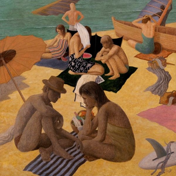 Curator: This is "Friends from Across the Lake" by Haddon Hubbard Sundblom. It seems to be rendered in a painterly style, perhaps with oil paints on canvas. Editor: My first impression is that this painting radiates nostalgia and warmth. The artist captures a relaxed gathering—figures drinking beer, sharing music and conversation on what appears to be a summer afternoon. The overall palette feels luminous, even inviting. Curator: Yes, the brushwork is quite expressive; it has an almost unfinished quality which imbues it with an undeniable energy. The composition leads your eye around the scene: note how Sundblom uses the trees as vertical markers, framing the tableau of human activity. Editor: I'm particularly drawn to the depiction of leisure here. It brings up a discourse about how the availability of free time and access to spaces such as lakeside cabins allows for social bonds and cultural exchanges like reading and record-playing. Considering the possible materiality of a record player itself and how its mass production brought about an appreciation for music across different levels of society... Curator: Precisely! And consider also, the significance of light—it’s used masterfully to sculpt forms. See how the light falls upon the foreground figures, highlighting textures and defining spatial relationships. Even the lantern seems to play a key part in providing direction to our perspective. The way that the faces seem to all lead up to this very light... Editor: You make a point about how central light becomes to the reading of these relational figures; I do feel it provides visual rhythm. And that this rhythm points towards the significance of that material warmth that binds all their actions together in harmony... one might venture to see how that can be understood on a larger economic level as well, perhaps? Curator: An interesting socio-economic lens! Well, whatever our perspective, the artist orchestrates a visually interesting composition, with contrasts of tone, form and the careful balance of colors that really creates dynamism and keeps the viewer captivated. Editor: Absolutely. It gives us a view into the artistic considerations around leisure and friendship, both as social constructs and pictorial representations, to ponder long after we leave.