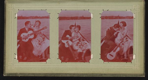 Editor: Here we have, from sometime between 1900 and 1930, "Three Portraits of a Couple in Love." I'm not sure of the artist's name, but the medium is photography. I'm really struck by the almost theatrical staging in each scene. What stands out to you about these portraits? Curator: Theatrical is a great word! It’s as if they’re enacting little stories. See how each image places the couple in a different setting, almost like a series of romantic vignettes? They're not just portraits, they’re little dramas of love. Does the artificiality strike you as odd, or is there a kind of charm in it? Editor: I see the charm! It feels a little staged, but endearingly so. Like they're intentionally playing up the romance of it all. Curator: Exactly! It's pure Romanticism, but filtered through the lens – literally! – of early 20th century photography. Consider the cultural context: the rise of studio portraiture, the desire for sentimental keepsakes. These aren't snapshots, they’re carefully constructed fantasies. Makes you wonder what their real relationship was like, doesn’t it? Editor: Definitely makes me wonder. It is fascinating to see how people wanted to portray themselves and their relationships. Thanks for sharing this context! Curator: My pleasure! It's a reminder that art, even seemingly simple photographs, always has a story to tell beyond what’s on the surface. And sometimes, the artifice reveals more than any posed honesty ever could!