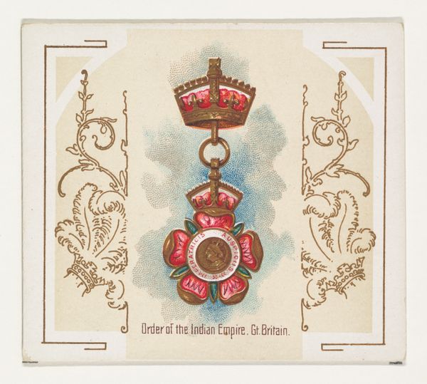 This is "Jewel of the Garter, Great Britain," a lithograph created by Allen & Ginter, part of the "World's Decorations" series for their cigarette cards. The image presents a heraldic emblem, dominated by a knight on horseback slaying a dragon. The composition emphasizes symmetry, with decorative floral patterns flanking the central image. The color palette is soft, using pastel shades to create an idealized, almost dreamlike quality. Here we see a formal representation that reflects the values of the British Empire. The knight is poised and resolute, and the dragon writhing beneath the horse's hooves symbolizes the triumph over perceived enemies. The emblem's symmetry can be interpreted as a reflection of the structured order the Empire sought to impose. Notice also how the soft colors and precise lines create an aesthetic experience but also uphold a hierarchy of power and civilization. The very form and structure of this cigarette card, therefore, becomes a signifier of cultural codes, inviting us to interpret and reinterpret its meanings within our own contemporary context.