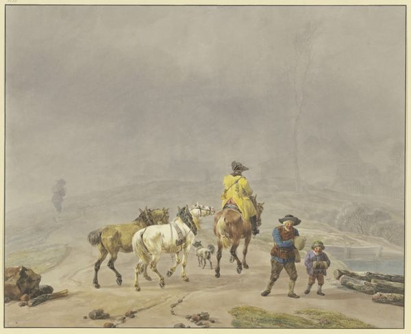 Curator: Welcome. We're standing before "Bauer zu Pferde und Maultiertreiber aus der römischen Campagna", a drawing on paper by Johann Adam Klein, rendered with coloured pencil and watercolor. It's currently held in the Städel Museum. Editor: Immediately, there's a tranquility to this landscape. The soft washes of color give it a dreamy, almost faded quality, like a memory. And that hazy sky really dominates the scene, doesn't it? Curator: Yes, the sky does command attention. The work adheres, formally, to a conventional landscape composition: a clear foreground with figures, a middle ground with hints of activity, and a distant mountainous backdrop. The palette, however, veers from stark realism. It's more muted. Editor: It’s a softened, idealized world. Look at the way the figures are positioned - a lone rider on horseback takes centre stage, while smaller figures tend to a mule. There’s a sense of human presence dwarfed by nature, romanticized perhaps. The composition suggests a hierarchy of the figures in relation to the landscape, with the lone rider elevated in prominence and height. Curator: I find the drawing quietly contemplative. The subtle shifts in tone—especially in the rendering of the sky—convey a palpable sense of atmosphere. This approach emphasizes a feeling of emotional engagement above literal topographical precision. Klein isn't just depicting the landscape; he's invoking a feeling within it, suggesting a harmony. Editor: And there’s a slight contrast of colours. The earthier tones in the bottom are set off beautifully against the gentle blue washes in the sky, lending to its serenity. Despite that clear distinction, there's harmony, nothing feels too contrasting. The scale of the humans emphasizes a sense of belonging. They feel nestled within this huge space rather than struggling against it. Curator: I agree. It speaks to Romanticism’s core—the interconnectedness between humanity and nature, an idealized and rather picturesque rendering of daily life that is a part of the grand landscape, an element rather than an imposing presence. Editor: Well, seeing it now, after delving into the colours, forms and subtle composition, has opened my mind and I now find myself truly appreciating the feeling evoked in Klein's "Bauer zu Pferde und Maultiertreiber aus der römischen Campagna". What a wonderfully insightful trip to the Campagna it has been!