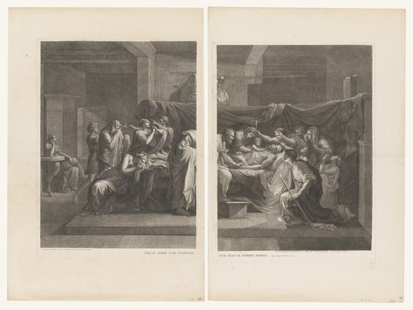 Editor: We’re looking at "Heilig Oliesel (linker deel)" by Jean Pesne, created between 1680 and 1694. It’s an engraving, and the scene is quite striking, almost theatrical in its composition. It seems to be brimming with emotions—grief and quiet resignation. What strikes you most about its visual presentation? Curator: The elegance of the engraved line, of course. Note how the artist uses varying densities of hatching to create a compelling tonal range. See the way that light seems to define the drama—it directs the viewer's eye through the arrangement of figures and establishes a clear sense of depth. Are you struck by how this focus shapes the scene? Editor: Definitely. The light really does lead you around. But why use line alone? It’s very… stark. Curator: Precisely. The linearity eschews painterly effects. Consider the pure form presented; the figures’ poses, the draping fabric. Pesne offers a classical aesthetic in the articulation of sorrow; all of which invites a deeper formal reading. What do you make of the figure arrangement? Editor: They seem posed, very deliberate, creating distinct geometric patterns across the image. Like a choreographed scene, even. It definitely amplifies the theatrical feel I mentioned earlier. Curator: It is through this structured arrangement that the scene’s narrative is distilled to its emotional core. By simplifying the scene to its core elements—line, form, light, and arrangement—Pesne emphasizes the work’s powerful narrative through its compositional elements alone. It begs the viewer to dissect it structurally for complete understanding. Editor: It's amazing how much can be conveyed simply through form. I’m certainly looking at it differently now. Curator: Indeed, and hopefully, gaining a greater understanding of the visual language at play in Baroque art and the power of line in expressing emotion.