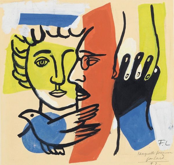 Curator: Standing before us is Fernand Léger’s “Figure,” created in 1947. It’s an oil painting reflecting the artist's distinctive approach to portraiture, very much aligned with Modernist explorations. Editor: It’s strikingly graphic, isn’t it? The bold colors—red, yellow, green—are intensely contrasted against the black outlines and blocks of the figure’s hair. It has a flattening effect, collapsing depth. Curator: Exactly. Léger was deeply influenced by the social climate following both World Wars. He aimed for an art that reflected the working class, a "popular" aesthetic, if you will. Note his use of strong lines and simplified forms – almost like machinery parts combined into a human representation. Editor: And how he flattens the pictorial space! There’s barely any modeling of the face. One half is a striking red plane while the other remains white with sharp, black outlines describing the facial features. This technique breaks with classical portraiture, offering a completely new vision of the subject. Curator: That rejection of illusionism was crucial. Léger sought to create universal figures, removing traces of the individual to represent collective humanity. He believed in an art accessible to all, rejecting elitist notions. It reflects post-war society and collective hope, yet can be viewed as caricature. Editor: It's a fascinating intersection of formal severity and what almost feels like playful disruption. The juxtaposition of abstract geometric shapes and figurative elements is key. The eye is forced to reconcile these seemingly disparate parts. Curator: Léger believed this reconciliation would engage the viewer directly in the image's construction, a move that also mirrored the rebuilding occurring across Europe. He sought an art of clarity and order reflecting societal desires, aiming at democratization in all fields, and specifically art and representation. Editor: Reflecting on the painting’s structure—it operates as a study of shape and colour, independent from conventional spatial relationships. Its brilliance lies in its tension, how the painting challenges traditional representational modes to offer a fragmented, but assertive, vision of a figure. Curator: Ultimately, Léger gives us an artistic interpretation born out of historical upheaval and social evolution, rather than just depicting a likeness.