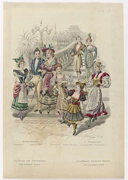 This lithograph, *Musée des Familles, janvier 1856*, presents a scene of domestic life in a family setting. The composition arranges figures in elaborate costumes across a shallow stage-like space, with a backdrop suggesting an opulent interior. The color palette is soft, dominated by pastels and muted tones, giving the scene a delicate, almost dreamlike quality. The composition emphasizes the artifice of display. Each figure is meticulously rendered with attention to detail, but their arrangement feels staged rather than natural. The various textures and patterns of the garments create a visually stimulating surface, drawing attention to the material culture of the time. The setting itself, with its decorative objects and ornate details, serves as a backdrop that highlights the refinement and privilege of the depicted family. This image serves as a coded communication of social status, cultural values, and gender roles. The careful arrangement of the figures and the emphasis on luxurious materials signal a world of elegance and leisure, even as they challenge the viewer to decode the underlying structures of power and representation.