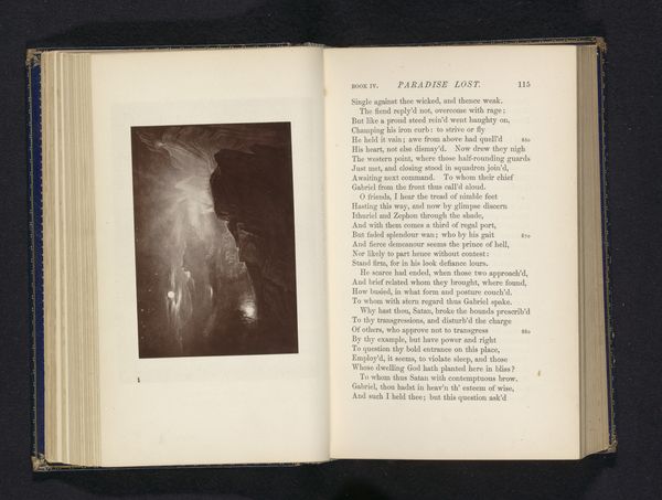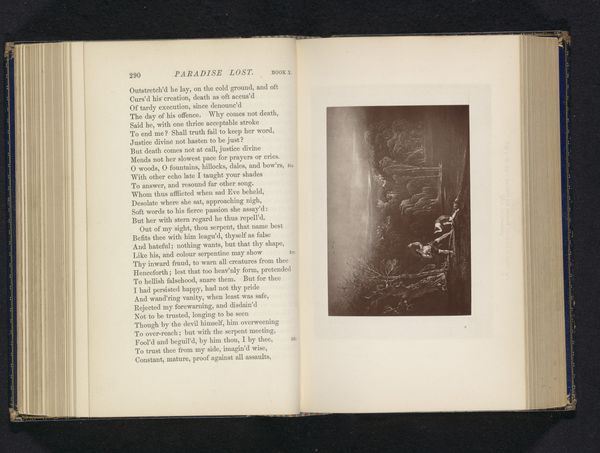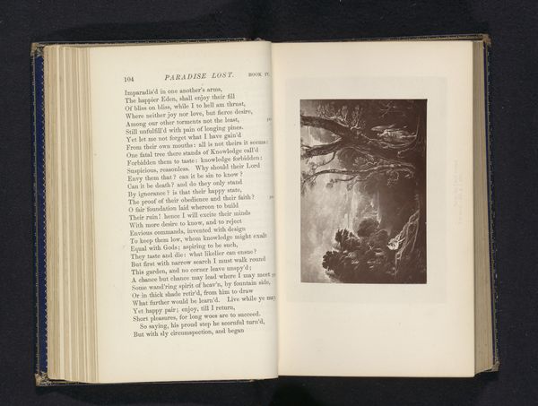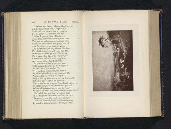 Curator: Here we have "Fotoreproductie van een prent, voorstellende Adam en Eva in het Paradijs," a photo reproduction of a print depicting Adam and Eve in Paradise. It's believed to be from before 1876. Editor: It’s surprisingly dramatic, isn’t it? All that looming darkness and what looks like an almost explosive light. Makes the paradise seem less, well, paradisiacal. It's unsettling. Curator: The visual symbolism of light and dark here plays a vital role. Consider the traditional iconography of the Fall. The dark could represent ignorance or sin encroaching on the original, illuminated purity of Eden. It is, in fact, from Paradise Lost, the expulsion of Adam and Eve. Editor: Absolutely, and I think about how these prints would have been reproduced and consumed. Photography making art more accessible—potentially widening access to religious narratives but also changing how people engage with them. Think of the labour involved; from the photographer to the engraver of the original, not to mention the printing process. It adds layers to the narrative, shifting focus to social aspects of religious culture. Curator: It’s interesting how that reproducibility impacts our understanding of the Fall itself. Original sin now available in multiple originals. That act echoes the psychological fracture caused by disobeying God – a splintering of the self. The print acts like a visual shorthand for this ancient trauma. Editor: A trauma mass-produced. Fascinating tension! But the very act of reproducing also transforms the narrative. Does something get lost, something added? Is it the process of copying this engraving from the past in order to create a photograph of the original, is that now an interpretation of paradise itself? Curator: I suppose every retelling inevitably reflects the values and concerns of its own time. And like Eden, perhaps an artwork also has an innocent origin which becomes complex over time through viewing and making! Editor: It seems the production and re-production add a significant material and social element, impacting how this old narrative persists to shape ideas today. It's an important part of understanding both art and ourselves!