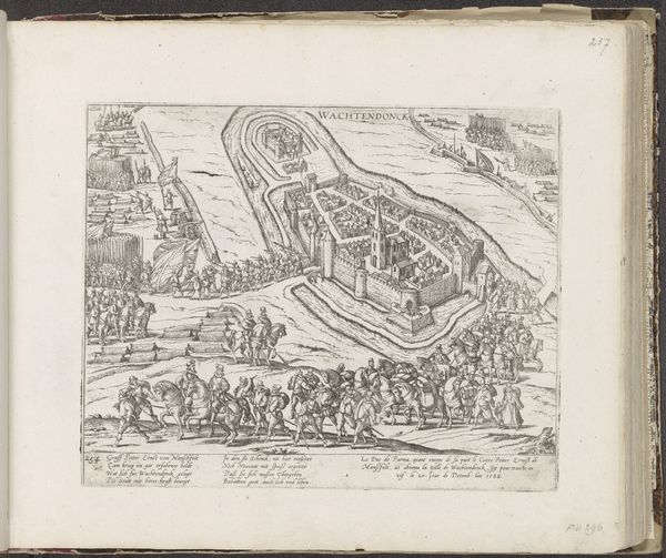 Curator: This detailed engraving depicts the 1590 Siege of Rheinberg. Frans Hogenberg created this print sometime between 1590 and 1592. It now resides here at the Rijksmuseum. Editor: It feels intensely busy, a real spectacle of war depicted in miniature. All of those tiny figures, almost like ants, swarming around this imposing fortress on the Rhine! Curator: Hogenberg was part of a workshop producing these images—his work sits within the history of printmaking as a specific means of mass communication. Note how he meticulously captures every detail, seemingly driven by a desire for accuracy. This wasn't high art in the modern sense; it was a form of visual journalism for the masses. Editor: Visual journalism, absolutely. You can practically hear the cacophony of clashing steel and panicked shouts. How do you think this imagery worked to stoke nationalistic fervor at the time, or shape public opinion on warfare? Curator: It fueled it! These weren't neutral documents. They promoted the idea of a divinely ordained political order, reflecting particular positions in the struggle between the Dutch Republic and Spain. Rheinberg itself changed hands several times. Editor: Looking closely, the materiality of the print is so central to its impact. Those fine lines etched into the plate, reproduced over and over. It becomes about how easily such inflammatory messages can circulate. What would it mean to consider this through a gendered lens? What impact did this have for those left behind? Curator: Considering it within a context of labor reveals it was likely an industrialized product. While Hogenberg’s name is most recognizable, it is difficult to isolate his specific hand within the complete process, or recognize any influences from women, or others that were working within the shop. Editor: I agree—emphasizing the collaborative context really deepens the art historical perspective. It pushes beyond just appreciating aesthetic style to examining these socio-historical dimensions, questioning everything. Curator: Right—understanding its construction reminds us that artworks like these are a product of their time, material, social and political contexts all come to the fore. Editor: Exactly. By looking closely, we begin to recognize how history itself is constructed and represented, one image, one print at a time.