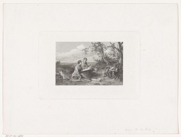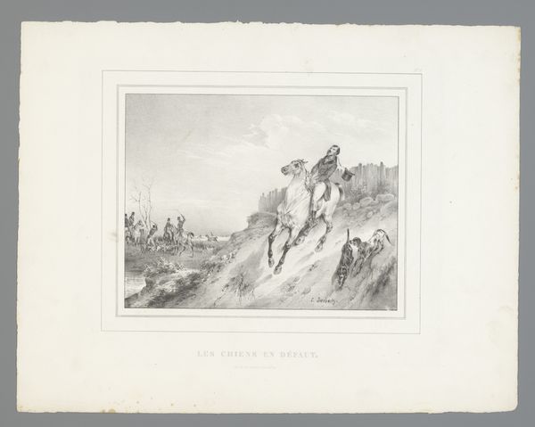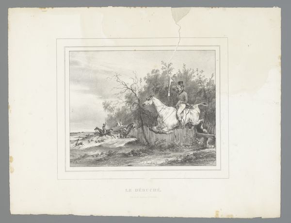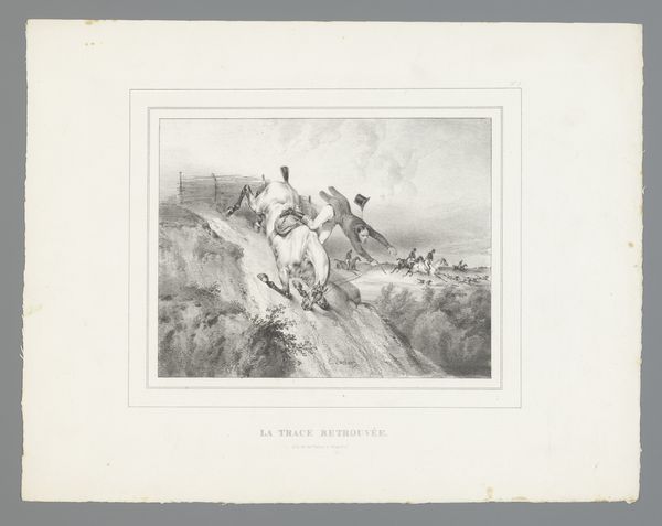 Curator: Let’s turn our attention to a print from around 1825, attributed to Bernard Édouard Swebach: "Man trekt onwillig paard de heuvel op" – or, "Man dragging unwilling horse up a hill.” Editor: It's stark, almost aggressively so. The harsh monochrome amplifies the struggle; the poor animal looks like it’s fighting for its very existence. A dark drama unfolding on a diminutive scale. Curator: It's an engraving, so yes, delicate lines building to intense shadows. You pick up on the drama that Swebach, even within the established conventions of Romantic landscape, depicts. Look how the man strains against the horse – a visible exertion that communicates tension and imbalance. Editor: Right, imbalance – physically, but symbolically too, perhaps? The rider’s posture speaks of an assertion of dominance, and the horse seems to symbolize something like untamed, wild nature forced into the service of will. Is that too cliché? Curator: No, that reading makes perfect sense. Especially if you consider the period's obsession with the Sublime, and humanity's complex relationship with the natural world, of control and awe, or fear of nature’s brute strength. Note how he places tiny soldiers behind them. Editor: Good catch! Almost an army on the horizon reduced to blurry shadows. Perhaps then the drama on the hill is small but mirrors some wider power struggle. What do you see when you linger on the image? Curator: Mostly, I’m drawn back to that hill, and to the absurdity, of how a goal, once established, can create conflict even as the landscape and sky seem undisturbed. Like the battle doesn’t concern the rest of nature. Editor: I wonder if it’s that quality, the battle waged silently that fascinates. After all, who hasn't experienced dragging themselves or been dragged to some destination, whether they wish to arrive or not? Perhaps that explains its power to move.