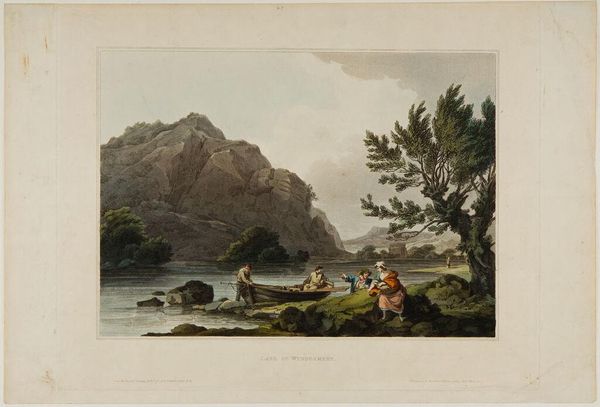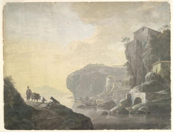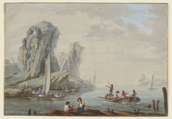 Curator: Let's consider this captivating watercolor by Jean Pillement, "Meeresbucht mit großen Felsen rechts und Fischern," created around 1769. Editor: It’s immediately striking, a gentle blend of blues and ochres. The overall feeling is one of tranquility mixed with a slight melancholy, perhaps owing to the subdued palette. Curator: Absolutely. Pillement, as a Frenchman deeply influenced by the Rococo style, brings to this scene a focus on the picturesque. We must examine his position within colonial trade routes and the way these "idyllic" landscapes often mask social and political undercurrents. Consider, too, how these images served as commodities, feeding into the orientalist fantasies prevalent among the European elite. Editor: That’s interesting. I am struck by the actual labor depicted here—the fishermen, their nets—the whole material business of wresting a living from the sea. It reminds me how art often obscures the physicality of the world, turning even work into a romantic vision. What type of nets they have, how are they produced? I am interested in their means. Curator: These details do resonate with larger socio-economic forces. Pillement isn’s just presenting a scenic view; he's showing us figures actively engaged in their livelihoods within a specific economic and cultural frame, perpetuating, as many of these landscapes did, a gaze and perspective rooted in colonial power. Who were those figures and did they partake in exploitation? Editor: Right, but also there’s a material connection to nature being presented—rock, water, nets—and their connection. Those are tactile, immediate realities. Perhaps those figures find the process empowering, and the material engagement liberating in the sense it’s tangible. Their labor has meaning. Curator: Indeed, and by analyzing Pillement's approach within the context of the colonial era, and post-colonial theory, we can begin to dissect how artistic representations actively shaped the collective imagination of that era, but also contemporary views. Editor: It does force us to think about what these idyllic views concealed about human effort. Looking at the art as artifact, in other words. Curator: Precisely, it prompts us to unravel not just what is seen, but who benefits from that seeing, the narratives being bolstered, and the power relations inherent within the gaze. Editor: So, by studying his methods and subject we learn a deeper lesson beyond simple aesthetics. Thanks for helping me with it. Curator: Indeed. A lens into production and its socio-political implications helps give it added weight.