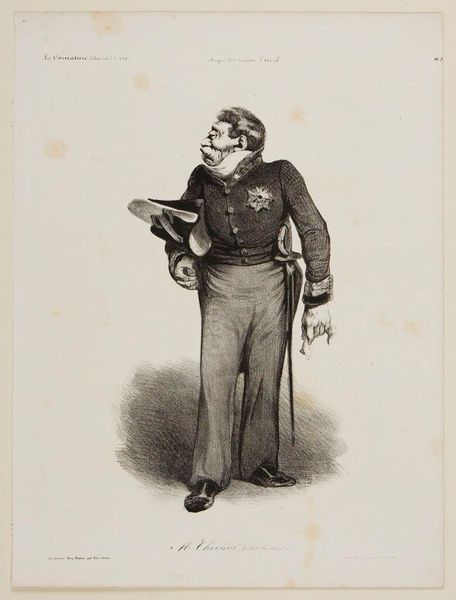 Editor: Here we have Honoré Daumier's "Mr. D'Argo." It’s a print, and I'm immediately struck by the subject’s exaggerated features. What do you see in the formal aspects of this portrait? Curator: The lithograph’s masterful use of line is evident. Note the strategic employment of hatching and cross-hatching. Where do you see the strongest contrast? Editor: Certainly, the stark blacks defining the contours and shading create a dramatic effect, especially around the face and coat. How does this contribute to the overall composition? Curator: The high contrast amplifies the caricature, directing the viewer's attention to specific features. It's a potent example of how line and tone can convey character. It is a commentary on form itself. Editor: That’s fascinating. I hadn't considered how the formal elements contribute to the commentary. Curator: Precisely. The medium and execution are inseparable from the subject's portrayal.