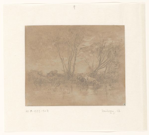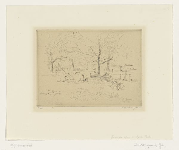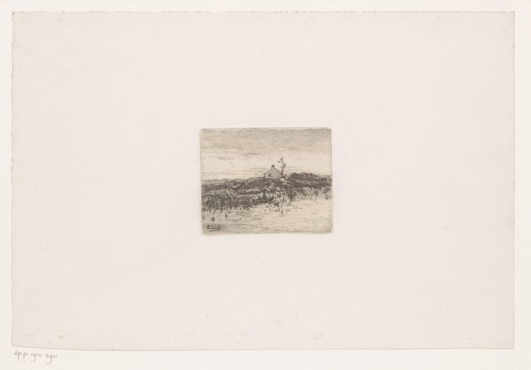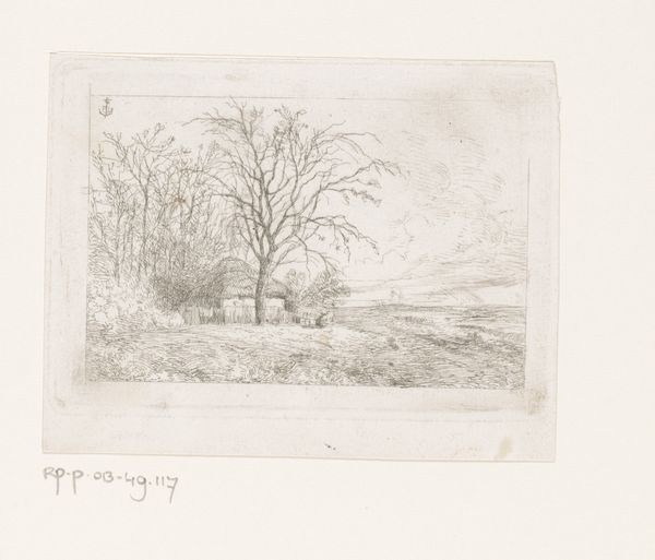 Paulus Lauters made this small landscape with a tiny building between bare trees using etching, a printmaking technique. The visual effect is achieved by drawing with a sharp needle through a wax coating on a metal plate. The plate is then bathed in acid, which bites into the exposed lines. The longer the plate sits in the acid, the deeper the lines, and the darker they will appear when printed. This one seems to have had a relatively short acid bath as the lines are quite delicate. Consider the labor that went into this seemingly simple scene: the careful preparation of the plate, the precise drawing, the controlled use of acid, and finally, the printing itself. Etching was embraced by artists like Lauters because it allowed for a level of detail and nuance not easily achieved through other means. It was a craft-intensive medium, demanding both technical skill and artistic vision. These traditional techniques have imbued the artwork with a sense of cultural and social significance. So next time you look at a print, remember to consider the means of production that brought it into being!