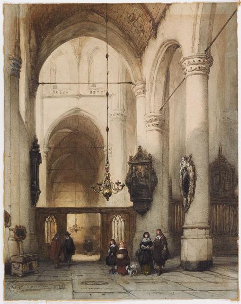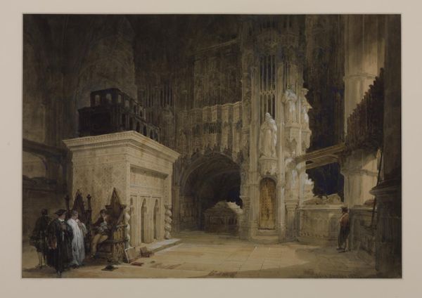 David Roberts created this watercolor of King’s College Chapel in Cambridge, where the architectural structure dominates the visual experience. The chapel's interior is structured by vertical lines of stained glass windows and towering columns, drawing the eye upwards. Roberts uses contrasting textures and tones to create a dialogue between the earthly and the divine. The rough, earthy textures of the wood paneling on the left, rendered in warm browns and intricate carvings, contrast with the ethereal, light-filled space of the chapel. This interplay invites contemplation on the relationship between the material world and spiritual aspirations. The composition, divided between the heavy, detailed woodwork and the luminous, open space, subtly destabilizes a fixed perception. Roberts captures a sense of awe and reverence, reminding us of the architectural and philosophical inquiries that resonate within such a historic and monumental space.