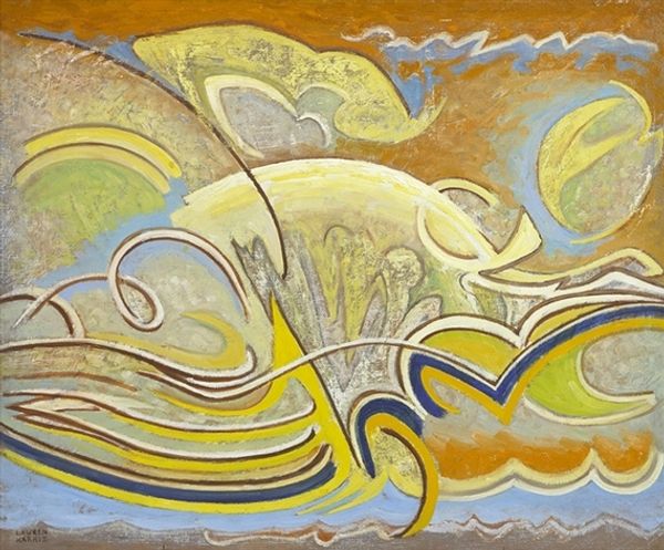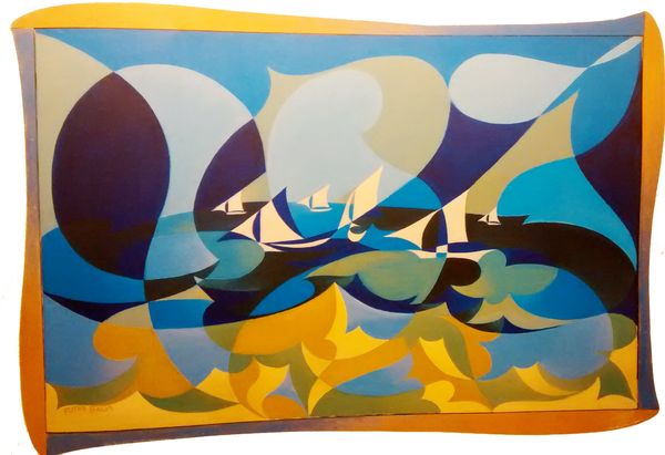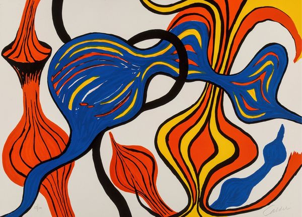 Curator: Let's consider Stanley William Hayter's "Hang Glider," held here at the Tate. It's an etching, and feels to me like a flight of fancy, all soaring lines and bold color. Editor: My first impression is chaos, almost overwhelming! The composition is dynamic, but the stark contrasts in color and the overlapping forms create a sense of instability. Curator: Hayter was all about pushing boundaries, especially in printmaking. He developed innovative techniques to achieve that layered effect, almost like a visual free-fall. It's daring, isn't it? Editor: Daring, yes, but also deliberate. Look at how the orange stripes create a rhythm against the blue ground, guiding the eye. There’s a structured tension beneath the seeming disorder. Curator: I love how he captures the feeling of being suspended, both exhilarating and a little bit terrifying. It really makes you think about the human desire to fly, to overcome gravity. Editor: Precisely. The title suggests flight, but the artwork grapples with the complexities of form and perception rather than a literal depiction. It's a study in organized visual tension. Curator: So, from pure chaos to organized tension, it seems Hayter has taken us on a journey of our own. Editor: Indeed, a journey through the intricacies of artistic expression and visual architecture.