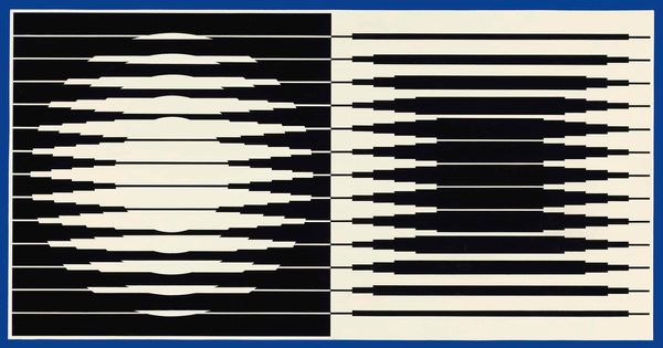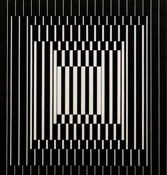 Curator: Before us hangs Victor Vasarely's 1957 piece, "Leyre-Hor," rendered in acrylic. Its geometric forms immediately command attention. Editor: It looks like a visual puzzle. Those contrasting black and white lines...they seem to vibrate! Is there something Mayan about the symbolic geometry at work? Curator: Possibly! Vasarely's engagement with Op Art really comes through. He wasn’t just creating patterns; he was crafting optical illusions. The very process demands precision, each line and form carefully placed to achieve the desired effect. Think about the production aspect: carefully chosen acrylic to give sharpness to those contrasting lines. Editor: The shapes arranged remind me of pictograms—a stylized face or a hidden message rendered in an abstract symbolic language. There's something archaic about it. Curator: Absolutely, and while that can be one interpretation, let’s remember the historical context. The mid-20th century was an era obsessed with technology and industry, so in line with those shifts in societal attitudes, this composition can be seen as a reflection of modern ideas where production and its inherent materiality takes center stage. It is the work of a craftsman even when the artwork depicts an industrial sensibility. Editor: Yes, and maybe that’s where the visual tension originates – the dance between industrial precision and the evocation of primordial symbols. Look at how these lines could also represent pathways. It's compelling how the work makes you ask these questions of ancestry while appreciating the construction, line-by-line. Curator: Indeed. By playing with perspective and form, Vasarely coaxes us into actively participating in seeing. It challenges the notion of art as passive object. The materials themselves dictate certain constraints to the possibilities of representation but within those parameters, Vasarely unlocks another level of potential in art making. Editor: In closing, "Leyre-Hor" demonstrates how what appears starkly modern may be deeply rooted in art's ongoing conversation with itself. Curator: It’s an intriguing visual experience, leaving you considering the relationships between process and perception, and whether the art is truly complete until the observer interacts with the canvas.