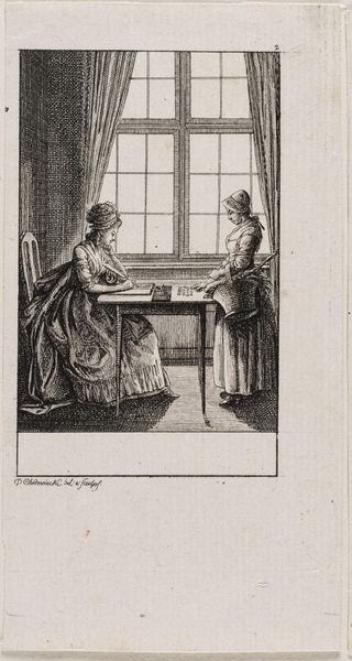 Curator: Immediately, I see a quiet domestic scene, a rather intimate moment. Editor: This is Daniel Nikolaus Chodowiecki's "The Occupations of Women: Embroidery," a delicate engraving. Let’s unpack the occupations embedded here. Curator: Beyond the literal act of embroidery, the image suggests societal constraints. The women are confined indoors, their roles defined. Even the man seems to observe, a passive participant in their world. Editor: Yes, and the needlework itself serves as a powerful symbol. It represents not only skill and artistry, but also patience, virtue, and the limitations placed on women's self-expression during that period. It's a loaded image! Curator: Indeed. The very act is imbued with both creativity and constraint. It's a fascinating study of gender roles and expectations. Editor: Absolutely, a small but potent window into a particular time and its coded visual language.