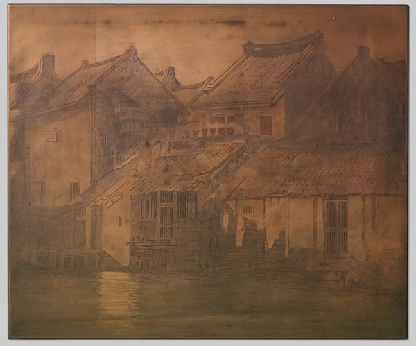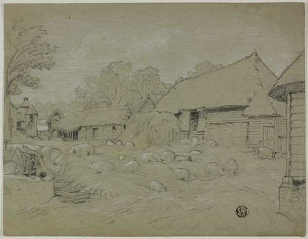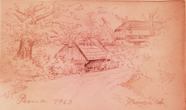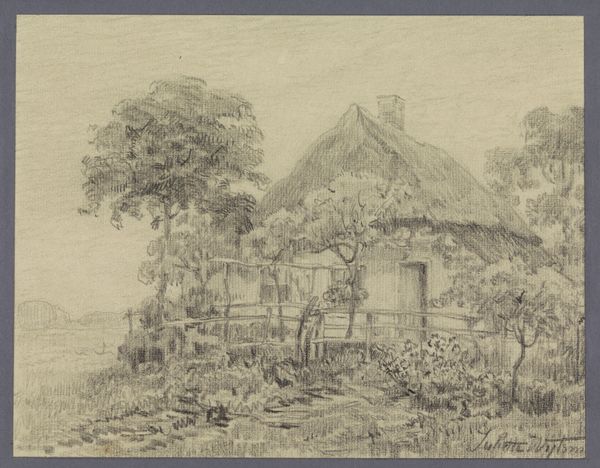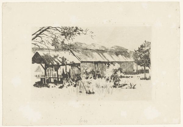 Curator: Willem Witsen created this ink drawing, titled "Lang bijgebouw, Gambar," around 1921. It resides here at the Rijksmuseum. Editor: It's such a delicate rendering. The toned paper gives it a nostalgic warmth. The long outbuilding appears almost dreamlike. Curator: Witsen's work often reflected the changing landscapes around him and the societal shifts of his time. The subtle detail hints at a traditional building gradually blending with the natural environment. The Gambar region was still relatively untouched then. This work might echo a societal move away from such landscapes. Editor: I’m drawn to the repetition of rectangular forms - the roofs of the two buildings, the posts holding up the outbuilding. It almost feels like the artist is searching for stability and structure within a scene of organic overgrowth. Perhaps the outbuilding functions as a potent symbol, a place for work, gathering, and contemplating the cycle of the seasons. Curator: Interesting observation, and it aligns with the changing role of agricultural labor back then. This visual vocabulary--buildings framed by the landscape--highlights a society's evolving relationship with its rural roots. Ink as a medium adds to the impression of decay and fragility. Editor: The eye is drawn to the subtle depiction of what could be interpreted as an observation point for the landscape in the smaller building. Is it simply practical? A dry spot from the rain? Or perhaps something deeper about looking onto or yearning to control the nature of landscape itself. Curator: I agree that this building adds further texture. Its construction does seem to hint at human manipulation, the ongoing project of claiming dominion. But it is an incomplete or decaying domination, don't you think? A constant process, an evolution and conversation rather than a full-stop. Editor: Indeed, it seems less a celebration of mastery and more a moment of wistful observation and a meditation on our temporal placement. Thank you, the viewing feels ever enriched by our shared consideration. Curator: Agreed, it’s important to remember that Witsen, like all artists, participates in shaping the ongoing narrative and visual iconography of our shifting socio-political sphere.
