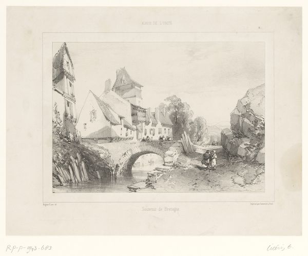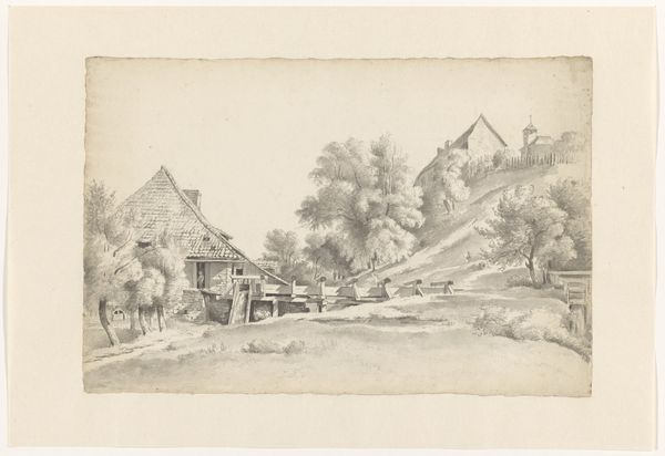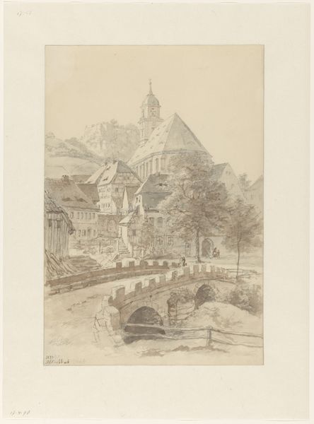 Victor Müller made this drawing, "Brückenhaus vor bergiger Landschaft," which translates to "Bridge House in front of a Mountainous Landscape," using graphite on paper. The artist has carefully rendered the textures of stone and foliage, paying close attention to the play of light and shadow. Notice how the graphite is applied in short, precise strokes to create a sense of depth and volume, particularly in the architecture of the bridge house and the distant castle. The bridge itself reflects the essential labor of the stonemason. The drawing's social context may be gleaned from the subject matter itself: the bridge symbolizes connection and commerce, while the distant castle evokes notions of power and authority. These elements, rendered with such care and attention, suggest a society deeply invested in its built environment and its historical legacy. Through this drawing, Müller bridges the gap between art and craft, reminding us that both are essential to understanding the world around us.