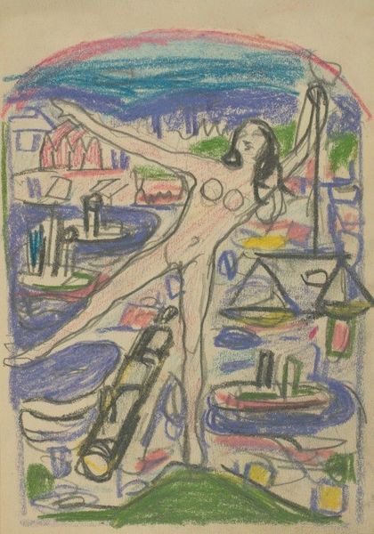 Curator: Welcome. We're standing before an intriguing work by Edvard Munch, tentatively titled "Untitled 10." It's undated, a colored pencil and drawing. The scene seems almost biblical but also deeply, almost jarringly, personal. Editor: It has this strangely joyful anxiety about it. A domestic tableau, but rendered with the raw immediacy of a sketch – the kind you might scribble on the back of an envelope while wrestling with a feeling too big to put into words. Curator: Exactly. There’s a tension between the subject—what appears to be a family group—and the looseness of the execution. The lines are hurried, almost frantic in places, and the colors are vibrant but unevenly applied. It disrupts any easy reading of domestic bliss, don't you think? Editor: Absolutely. Those bright, almost clashing hues - the blues against the flesh tones—create a strange kind of disharmony. Is that a bowl of…eyes?...the figures in the image, everything floats precariously. Like it might all just dissolve back into the ether at any moment. Curator: One of the things that strikes me is how Munch is grappling with figuration and abstraction here, perhaps at the same time. We have the figures, clearly rendered as human forms, but then they’re placed within this abstracted landscape with bold expressive marks. It's reminiscent of his Symbolist contemporaries, who sought to convey emotional states through non-representational means. Editor: Yes, it's a tug of war between observation and inner experience. This colored pencil and drawing might even show the internal struggles that come with family—between affection and alienation, closeness and distance. You know? The beauty and the bother of kinship. Curator: Well put. It reflects a broader tendency of the time: trying to use these visible forms to capture very non-visible feeling. Editor: And in that tension is precisely where the power resides. It is this unfinished and searching, rather than arriving at any neat conclusions. It gives the viewer an awful lot to do! Curator: Indeed. Thanks for pointing it out. Editor: My pleasure.