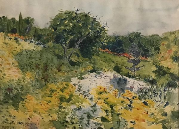 Curator: Before us is "Landscape, California" by Denman Waldo Ross, held at the Harvard Art Museums. Editor: It’s lovely! The soft washes of watercolor create a hazy, almost dreamlike scene. Curator: Indeed. Ross employs a limited palette, focusing on gradations of green and blue. This simplification of color lends itself to an investigation of form. Editor: I wonder if that simplification also reflects a desire to capture the particular quality of light in California at the time. How were artists depicting the landscape in opposition to industrialization? Curator: An interesting socio-political interpretation. Formally, observe how Ross uses the white of the paper to define the clouds, creating a sense of depth and atmospheric perspective. Editor: It is a compelling image, no matter how you slice it. Curator: Agreed. A deceptively simple yet complex study in composition.