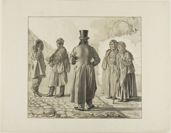 This print, Scenes from Russian Folk Life, was created by Ignatii Stepanovich Shchedrovskii in the 19th century. It uses a printmaking technique called etching, where lines are incised into a metal plate, and then filled with ink to make an impression on paper. The image shows the stark realities of Russian life through contrasting figures: laborers, and what appears to be an officer overseeing them. The etching technique suits this narrative well, the stark lines and tonal gradations creating a sense of contrast and tension. It speaks to the social context of Russia at the time, with its rigid class structure and the labor of the working class being observed. By focusing on the way this print was made, and the world it depicts, we begin to see how art and craft can shed light on the complex relationships between labor, class, and society.