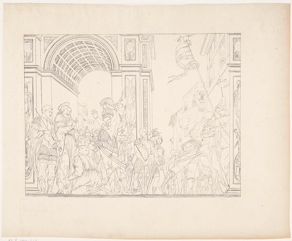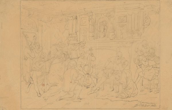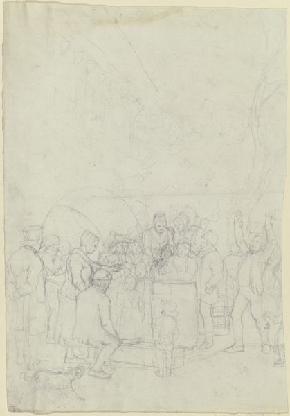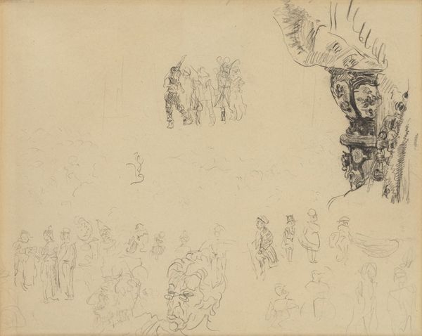Antoon Derkinderen created this drawing, "Scène in een troonzaal," using graphite on paper. The composition arranges figures within a stark architectural space, dominated by the raised platform of the throne. Derkinderen masterfully employs line to delineate form and space, creating a study in contrasts between the solidity of the figures and the ethereality of the room. Notice the sketch-like quality; the artist leaves much of the space untouched, inviting the viewer to complete the scene. The linear structures here remind me of structuralist principles; the artist’s choice to render specific details while omitting others suggests a system of signs at play. The sketch destabilizes established meanings; Derkinderen presents a scene that feels both present and incomplete, historical yet timeless. The stark simplicity of the drawing materials emphasizes the foundational elements of art-making itself.