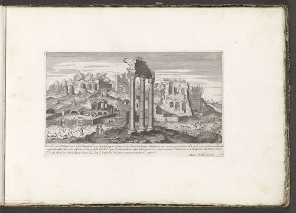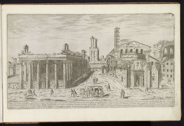 Curator: Let’s turn our attention to this intriguing 17th-century cityscape. Attributed to an anonymous artist and created around 1680, it presents an engraved view of Rome featuring the Temple of Antoninus Pius and Faustina alongside the Temple of Romulus. Editor: My initial impression is one of striking balance. The composition feels meticulously ordered, almost mathematical, with the temples presented in parallel alignment against the receding cityscape. There’s a clear visual hierarchy established. Curator: Precisely. Considering the Baroque period’s socio-political climate, these classical structures stand as potent symbols. These weren’t simply depictions of old buildings, but assertions of power, continuity, and legitimacy constructed to support dominant patriarchal structures. The revival of classical forms was meant to solidify links between past and present, to emphasize a kind of inherited authority. Editor: Indeed. But focusing on the formal elements, observe how the artist employs the precise, linear quality of engraving. It serves not only to accurately represent architectural details but also to imbue the scene with a sense of austere grandeur. Light and shadow play strategically across the surfaces, accentuating the geometry of each form and conferring depth. Curator: I think this approach deliberately minimizes the everyday realities. We need to remember that while we’re presented with an idealized vision of Rome’s architecture, it neglects the complex social and economic struggles happening in this period. Was the glorification of the past and its association with divinity a conscious act that intentionally eclipsed present problems? Editor: A valid perspective. But doesn’t the technical prowess speak to a reverence for rational order and human achievement, values prized by classicists even today? Look at the receding planes. The composition emphasizes perspective; each form carefully diminishes with distance. It constructs an idealized visual space as a system of representation that makes this reading plausible. Curator: True, the masterful technical rendering is important to acknowledge, yet what of the narrative constructed? Rome is presented as an open book for the cultured traveler; and that privilege, that opportunity, was clearly restricted to an elite. Editor: An astute observation. While the anonymous authorship hinders direct biographical interpretation, it’s this careful arrangement of lines, shapes, and spaces that evokes a sense of monumental permanence. Curator: On balance, reflecting on this image gives a window into art's potential to simultaneously reveal and conceal its societal influences. Editor: And to see its timelessness. An impressive fusion of historical documentation and symbolic formalism, regardless of artist attribution.