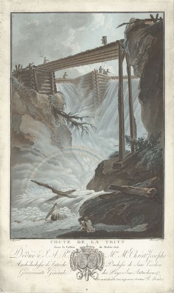 Curator: Oh, my. It feels like a dream, almost staged. The light! Editor: It's Jean François Janinet’s "Fall of the Tritt near the Iron Foundries at Oberhasli." Look closely at how the human endeavor, the industrial labor near the falls, is framed. Curator: Framed, yes, but also dwarfed. The rainbow at the base of the falls seems to mock the little wooden aqueducts and the figures walking on them. Editor: Exactly. The printmaking process itself highlights this tension. Think of the labor needed to create the plate, the control, versus the chaotic force of the water. Curator: Maybe it’s about humanity finding its place, or maybe losing it. That rainbow... promise or illusion? Editor: Perhaps it’s a question of how we consume nature’s resources and represent that act. Curator: Yes, and how nature continues regardless. I like that it remains a question. Editor: Indeed. It asks us to consider the cost, artistic or industrial, doesn’t it?