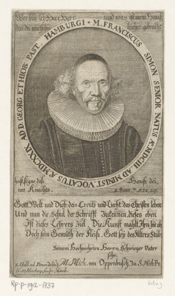 This is a portrait of Hans Caspar Escher by Johannes Meyer II, rendered with etching. The most striking formal element here is the contrast between the dark, densely etched areas of the subject’s clothing and the more sparsely etched face. The linear precision of the etching technique allows Meyer to define the textures of fabric and skin, creating a tactile dimension. The oval frame enclosing the portrait and the rectangular cartouche below offer a contrasting geometry that sets off the figure. Encoded in the inscription surrounding the portrait and the text below, Meyer conveys Escher's importance and virtue, indicating how the visual and textual elements are combined. This is a highly structured composition, where each element contributes to a cohesive statement about status, character, and cultural value. This integration suggests that the artwork's meaning is carefully constructed through formal and semiotic means.