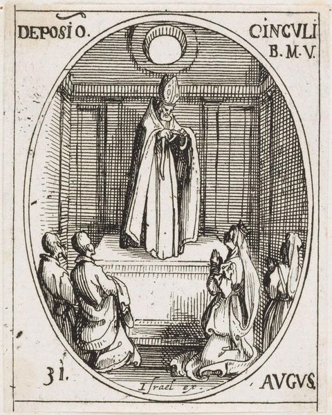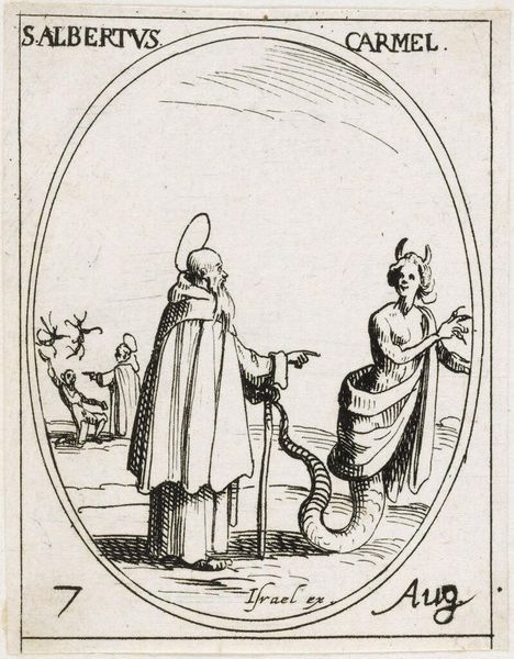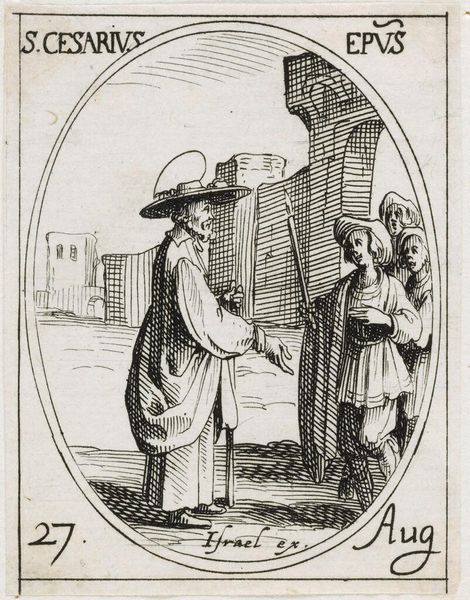 Curator: This is Jacques Callot's "Saint Patricia," a small but captivating etching. It's interesting to note its miniature size, only about 3 by 2 inches. Editor: It feels strangely monumental despite the size. The figures have such solemnity, almost a quiet, pilgrim-like determination. Curator: Absolutely. Callot had a real knack for imbuing even his smallest prints with such gravity. Think about how prints like this circulated, these images of saints were meant to be devotional objects for personal use. Editor: It feels like a journey inward, doesn't it? The simple lines really get at something elemental about faith and the journey. The building behind them is just a suggestive shape, like a symbol of hope. Curator: The etching technique, the way the lines define form, truly is beautiful. Callot's known for his mastery of the medium. Editor: There's such power in its simplicity. It lingers in the mind long after you've looked away. Curator: It reminds us that art can be a very personal and reflective experience. Editor: Indeed, a reminder of the potent connection between art, belief, and the enduring human spirit.