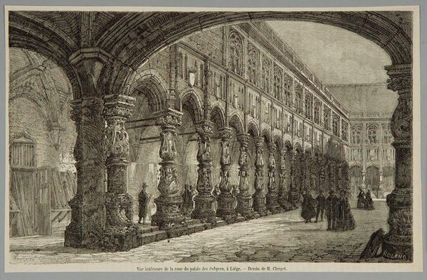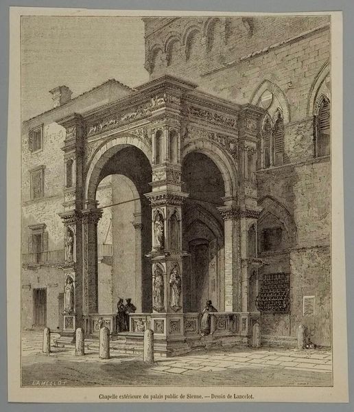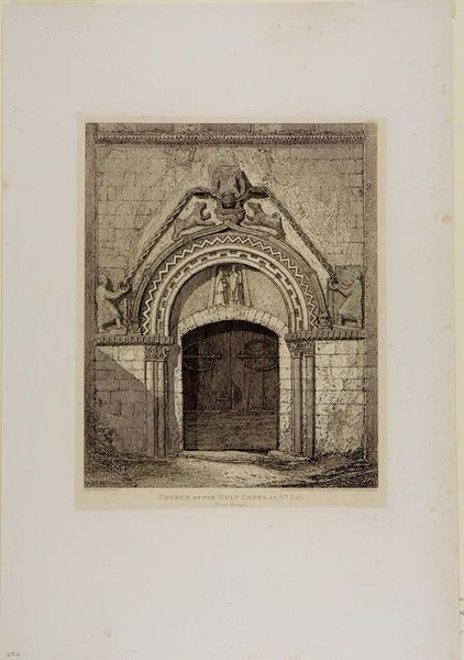Curator: This print, "One of the Side Doors of the Cathedral of Seville," offers a glimpse into the architectural grandeur observed by Philippe Laurent Roland. The scene itself looks to be a copy of an earlier drawing by Olivier Merson. Editor: The weight of history is palpable; it evokes a sense of both the sacred and the everyday, doesn't it? The contrast between the figures and the cathedral is rather intriguing. Curator: It speaks to the relationship between the Church and the people. The door, with its carvings and embellishments, acts as a threshold between the secular and the divine. Editor: Yes, the archway particularly draws me in—repeated circular motifs and detailed carvings. It seems designed to invite contemplation about something beyond the visible. Curator: And consider the figures at the entrance—their clothing, their postures. What stories do they tell about gender, class, and the role of the church in their lives? Editor: Indeed, they seem almost dwarfed, reinforcing the cathedral's power. It's a potent visual metaphor for the Church's influence on daily life. Curator: By understanding the historical and social context surrounding this image, we begin to unravel the complex narratives of faith, power, and identity. Editor: Such a wealth of meaning encoded into a seemingly simple depiction.