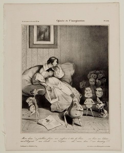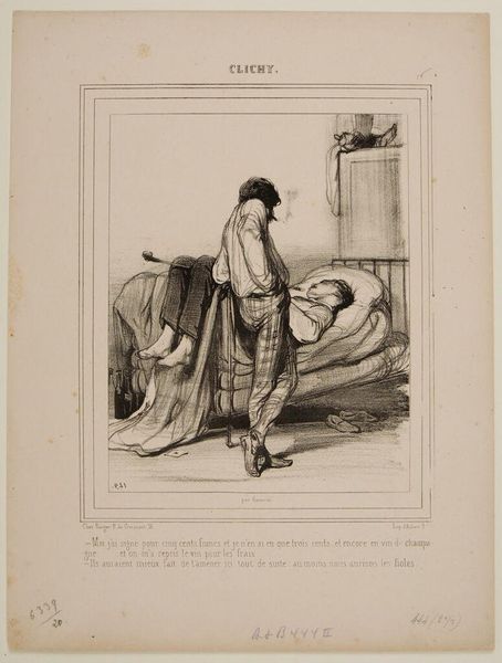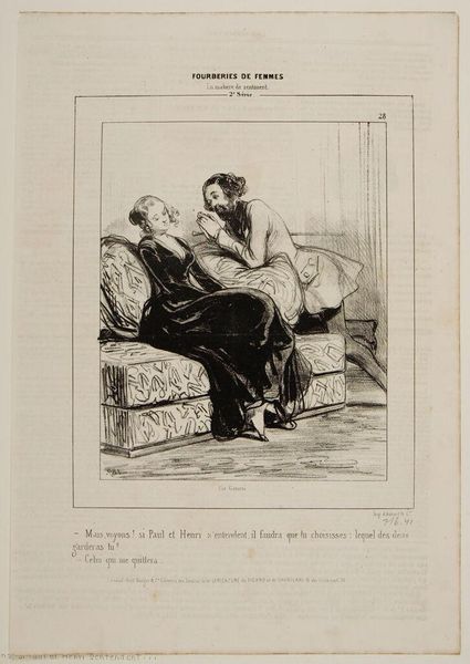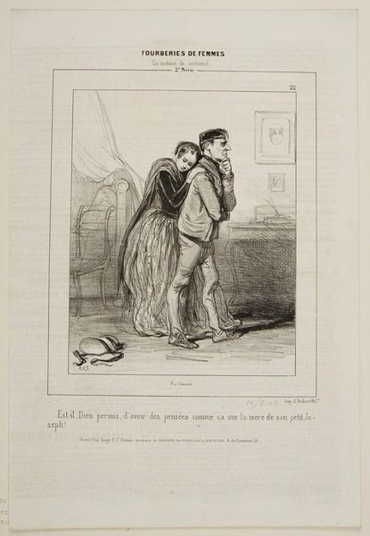 Curator: Paul Gavarni, born in 1804, created this rather sardonic lithograph, "The more I see you, the more I love him." Editor: Oh, this has such a charged atmosphere! It's amazing how he captures that tension with just a few lines. Curator: The composition emphasizes the woman's dominance as she leans over the man, who's almost reclining. There's something unsettling about the power dynamic. Editor: It feels like love laced with a cruel joke, doesn't it? The title suggests infatuation, but her expression hints at something colder, more calculated. Curator: Maybe it reflects the social commentary Gavarni often explored, the complexities and ironies of relationships. Editor: Yes, looking at the stark contrast of light and shadow I think it is an important work! Curator: A dark humor, indeed, that still resonates today.