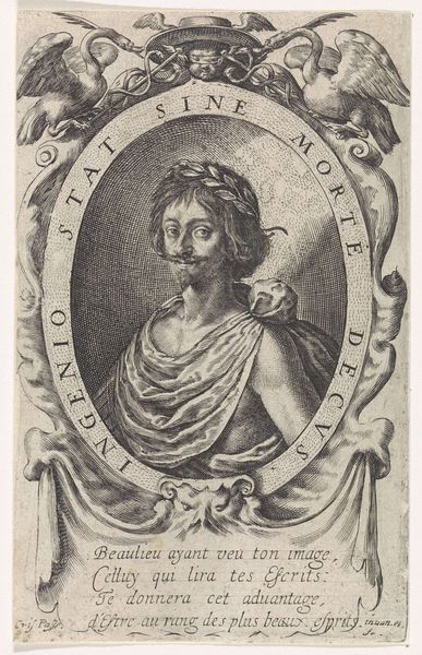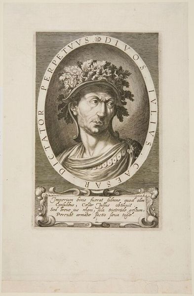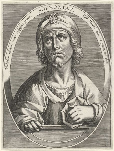 Curator: What a stark, arresting image. Editor: Yes, a wave of sadness just hit me. The man's weary expression cuts right through, despite the artifice of the style. Curator: We are looking at "Ecce Homo," a print of unknown date by Johann Michael Püchler. The image, made with engraving on paper, depicts Christ crowned with thorns. Editor: That title, “Ecce Homo,” "Behold the Man" Pontius Pilate's declaration as he presented a scourged Jesus to a hostile crowd... It implicates the viewer. Are *we* the crowd, complicit in his suffering? Curator: Indeed. The suffering of Christ is meant to evoke not just empathy, but also recognition of the universal human condition. What symbols do you observe? The crown of thorns, naturally, refers to His Passion. And the surrounding text, forming a halo, reinforces a similar theme. Editor: But the *entire* image is made up of tiny text. This isn't just ornamentation; it is integral. I’m finding it almost unbearable to meet his gaze. Are we supposed to be able to literally *read* the words that form his image? What effect does that produce? Curator: That's an excellent point. The words *do* matter. Notice also how the artist meticulously crafted every curve, every shadow. Each droplet of blood. Such artistic control echoes an effort to guide, or even dictate, our interpretation. It also evokes specific traditional representational practices tied to cultural expectations and values during the late Renaissance, in Europe. Editor: Right, to what extent does it encourage genuine pathos versus enforcing prescribed religious feeling, a sense of guilt and piety directed by religious doctrine. Curator: That tension is what gives this image its lasting power. The skill employed to forge this type of "devotional image" for viewers to emulate may provoke diverse responses within a contemporary public audience. Editor: Absolutely. Thinking about the conditions surrounding its creation illuminates some difficult truths. I feel its power more keenly, now. Curator: For me, the emotional power still resonates across centuries. It reveals enduring symbolic meaning, reminding us of the psychological depth inherent in religious iconography.