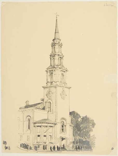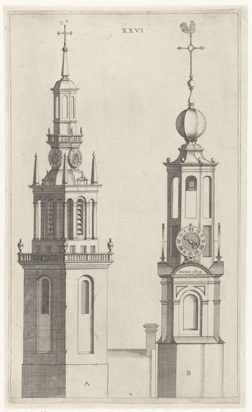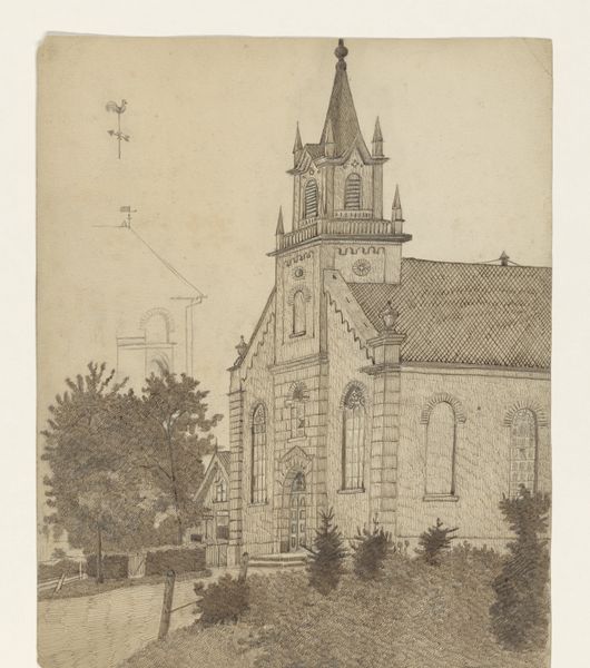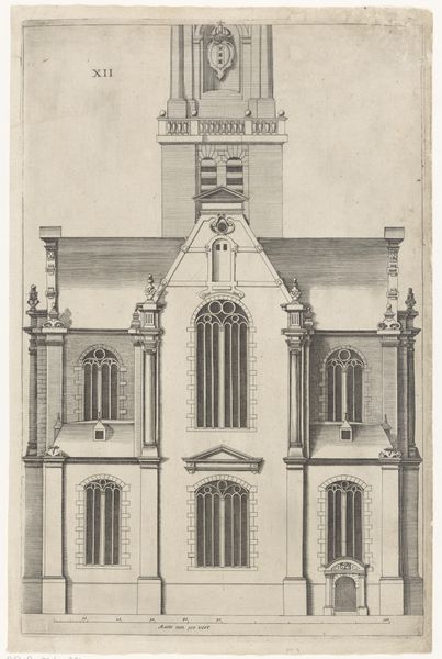 Editor: This is an engraving from 1784, titled "View of the Newly Founded Church, Now the Waardkerk, on the Oranjegracht in Leiden," made by an anonymous artist on paper. The detail is incredible! It almost feels like an architectural blueprint. What are your thoughts? What stands out to you in terms of its visual elements? Curator: Note the emphasis on line and form. The composition hinges upon a precise rendering of geometric volumes. Consider how the verticality of the tower dominates, establishing a visual hierarchy. The relationships of these geometric volumes—cubes, pyramids, and cylinders – establish a sense of balance and proportion that reflect neoclassical ideals. Do you observe the orthogonals in the drawing, and what effects do they generate for our viewing? Editor: I do see how the lines create the structure and guide your eyes, particularly to the tower and the way the facade lines are rendered. Does the precision of the drawing limit its artistic expression or enhance it? Curator: Precision serves as its expressive mode. It privileges rationality and order over subjective interpretation. Observe the minute details of the windows and their arrangement. Each element contributes to the overall structure, generating a sense of stable equilibrium. Editor: So, instead of feeling cold, this precision actually communicates a sense of... stability and permanence? Curator: Exactly. This engraving functions as an objective record but also engages us through its very formal qualities: the relationship between line, form, and space. The overall formal configuration evokes clarity, rationality and order. The engraving shows an architectural presence. Editor: That's a fascinating point. I initially saw just a straightforward depiction of a building, but your emphasis on structure helps to better clarify its effect. Curator: The methodology offers one path. Other theoretical positions might yield different findings regarding this interesting formal construction.