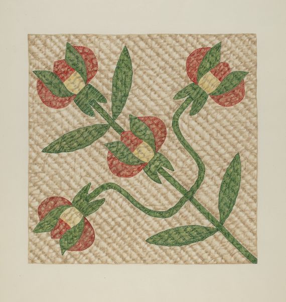 Editor: We're looking at a drawing from 1938 called "Quilt - Rose Design" by Ralph Atkinson. It seems to be a design for a textile, maybe a quilt. It’s very orderly and… homey, I guess. What do you see when you look at this? Curator: Well, I’m immediately drawn to the materiality of the imagined textile. Consider the labor involved. Before 1938, much of the quilt-making process was intensely manual, with women spending countless hours cutting, piecing, and stitching. This piece exists on the cusp, where industrial production begins to lessen labor demands of quiltmaking but has not become ubiquitous. The design implies a social fabric that has become the basis for its existence. Editor: Social fabric, what do you mean by that? Curator: It speaks to the quilting bees, community efforts, women supporting women, building something together – both physically and socially. You can see it referenced in the geometric nature of the quilt, but in the softer imagery of roses to maintain and pay homage to older social orders. Consider the source: what stories might the creator or consumers want to share and re-create as part of this work? Editor: Oh, that makes a lot of sense! The pattern does feel very deliberate and evokes social production processes. It's less about individual expression, perhaps? Curator: Precisely! We can’t ignore that design plays a major role here; a mass-produced design alters notions of preciousness of art. Was Atkinson employed by a textile company to produce this drawing, and in that case is it even appropriate to name them the sole "artist" of the design? The work, like any quilt design, sits at the intersection of art and craft, challenging established hierarchies. Editor: It's fascinating to think about all the hands, imagined or real, involved in the production and use of something that seems so simple on the surface. Curator: Indeed, examining the process, materials, and historical context can radically change how we perceive a piece of art.