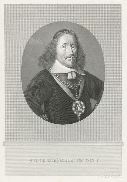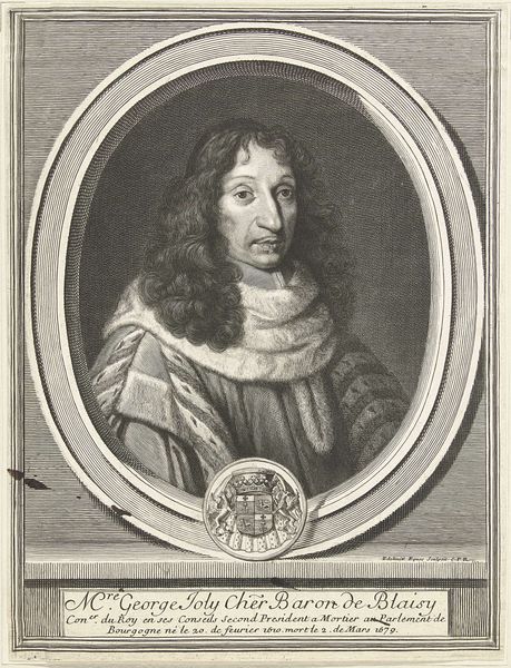 Editor: Here we have "Portret van Pompone de Bellièvre," a Baroque print by Gérard Edelinck, created sometime between 1666 and 1707. The man's gaze is striking, and the oval frame really draws your eye to his face and opulent clothing. What are your first impressions, seen purely from the formal perspective? Curator: It is important to consider how the visual elements coalesce. The precision of the engraving technique employed creates an arresting interplay of light and shadow, delineating the textures of fabric and flesh with remarkable fidelity. Observe the undulating lines that compose the hair, juxtaposed against the geometric patterns of the robes. How might you analyze the relationship between the textures presented in the artwork? Editor: That's a good point. The contrast between the soft fur and the rigid lines of his robes does create a kind of tension. It almost feels like a visual representation of his personality, or his role. How intentional do you think that contrast was? Curator: Intention, from a formalist standpoint, resides within the work itself. We might see the dynamic interplay between line, texture, and form reflecting the duality of man’s status and nature in 17th-century France. Consider the placement of the crest. Does it contribute to or detract from the overall visual balance of the composition? Editor: It feels essential. It anchors the bottom of the oval and reiterates Bellièvre's identity. So, even without knowing the historical context, the composition gives us a sense of his importance. Curator: Precisely. By focusing on the formal properties of the print, one gains insight into the strategies that bestow a particular presence upon the person depicted. Editor: I never considered how much the composition itself can speak volumes, regardless of subject matter or context. Curator: Indeed. The visual grammar, when read closely, often reveals more than a simple identification ever could.