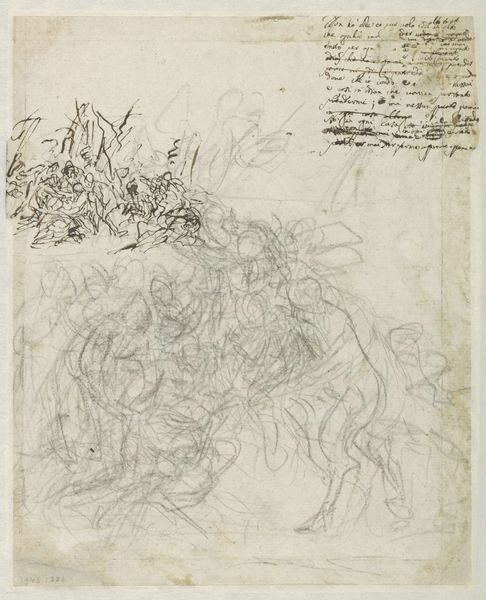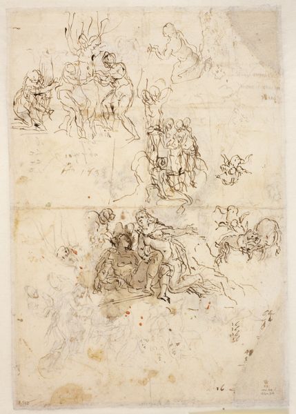 This is a pen and brown ink sketch by Jacopo Palma, the younger, who lived in Venice during the late 16th and early 17th centuries. It contains studies for a number of different figures and motifs including Christ, horsemen and floral ornaments. The prevalence of religious imagery in Venice at this time speaks to the important role the Catholic Church played in the city’s cultural and political life. Palma was commissioned to create paintings for a number of Venetian churches and chapels, so it is possible that these sketches were preparatory studies for a larger religious artwork. The presence of the horsemen may allude to the importance of Venice as a military power. The Venetian Republic was known for its strong navy and its ability to defend its trade routes and territories. Understanding this drawing requires that we examine the wider context of Venetian society and culture in the early modern period, looking to sources such as historical documents and religious texts. In this way, we can better understand the ideas and values that shaped its creation.