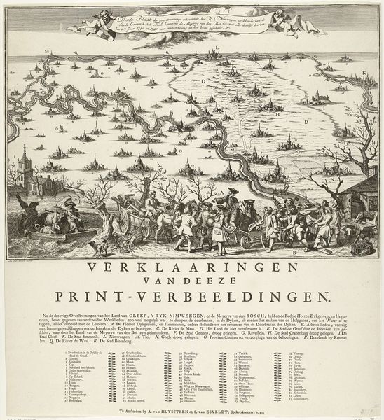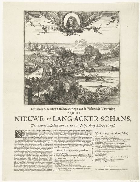 This anonymous print from July 1673, currently at the Rijksmuseum, captures the conquest of Nieuwe Schans. Immediately, one is struck by the graphic clarity of the map, sharply contrasted with the chaotic dynamism of the battle scene below. The meticulous rendering of the fortress, with its geometric precision and star-shaped layout, presents a stark contrast to the disordered figures of the attacking troops. The map employs a semiotic system of lines and symbols to denote terrain, fortifications, and troop movements. This creates a detailed visual language that not only represents space but also communicates strategic intent and military power. The contrast between the rigid structures of the fort and the fluid chaos of the battle challenges fixed notions of order and control. Note how the formal tension between the map’s clarity and the battle’s disarray serves to destabilize any singular interpretation. The work suggests that meaning isn’t fixed, but emerges from the interplay of different perspectives and representations.