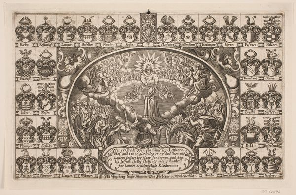 This is Hendrick Goltzius's "Benedicta tu in Mulieribus," an engraving made sometime in the late 16th century. The composition is structured around a central, seated figure, presumably the Virgin Mary, surrounded by a group of women. Above, a fountain sprays water which falls like seeds or stars, creating a visual sense of abundance. Note the intricate border filled with text and symbolic imagery. The artist employs a dense network of fine lines to create areas of light and shadow, giving volume to the figures and texture to the draperies. The structure and composition of this piece are not merely decorative. They function as a semiotic system, using recognizable symbols to communicate complex theological ideas. Consider, for example, the fountain, which may symbolize the source of grace, or the surrounding figures, who could represent the virtues associated with the Virgin Mary. Goltzius challenges fixed meanings through the layered use of symbols and visual metaphors. The engraving destabilizes simple interpretation, offering a rich site for ongoing contemplation.